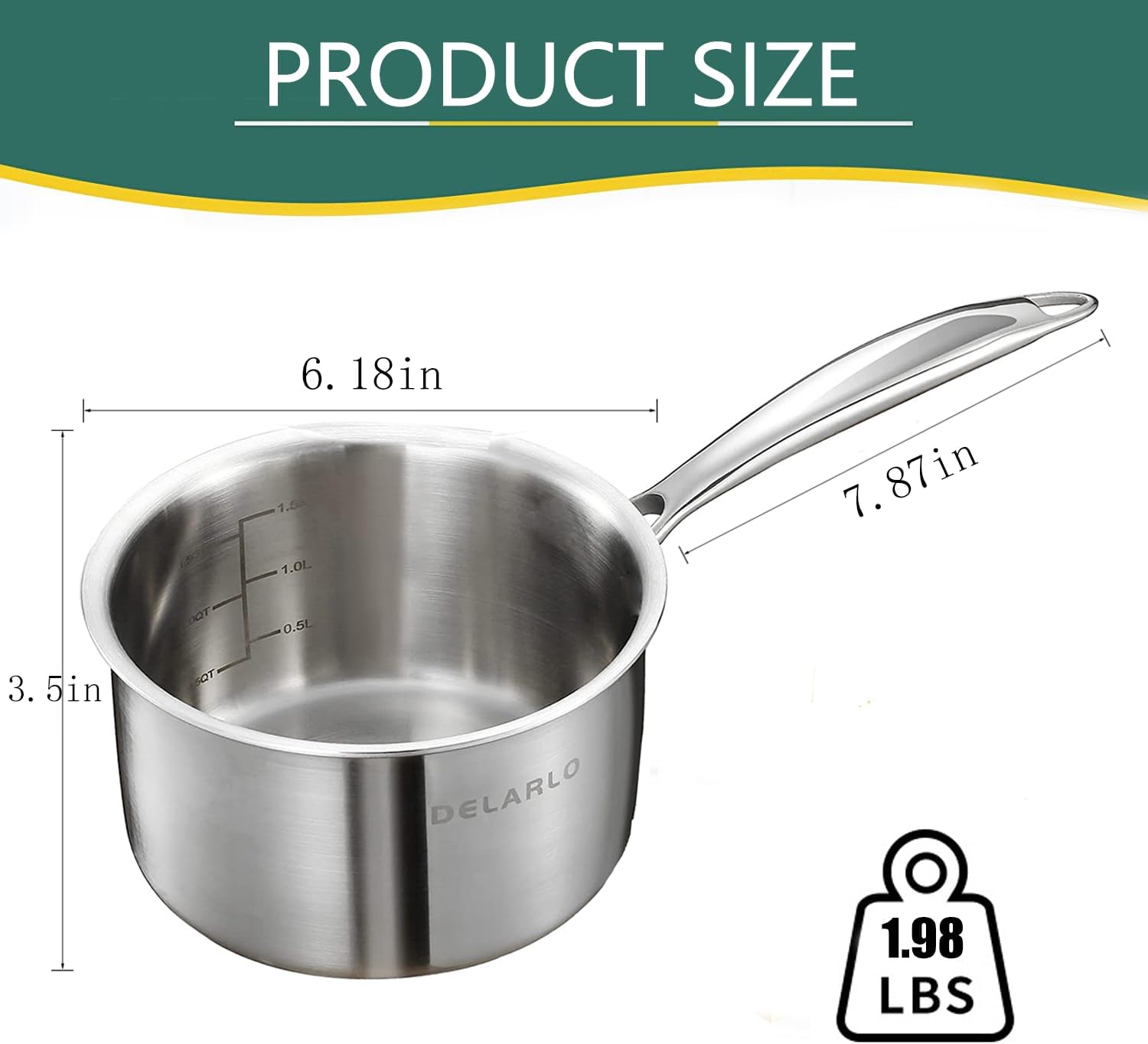 - Heavier and Thicker Than Ordinary Small Sauce Pan! The Thick Fully Clad Three-Layer Steel Material, With The High Side And Round Rim Design, Enables Delarlo Small pots to Have Quick Response And Durable Performance, Making The Soup Less Likely To Spill Over. Even After Hours Of Boiling, Small stainless steel pot Can Still Maintain Its Performance. With The Lid on, It Remains Warm For A Long Time After Being Cooked. Small Sauce Pan with LidIs Suitable For Making Anything Like Candy, Sauce, Butter, And Milk, Syrup Etc
