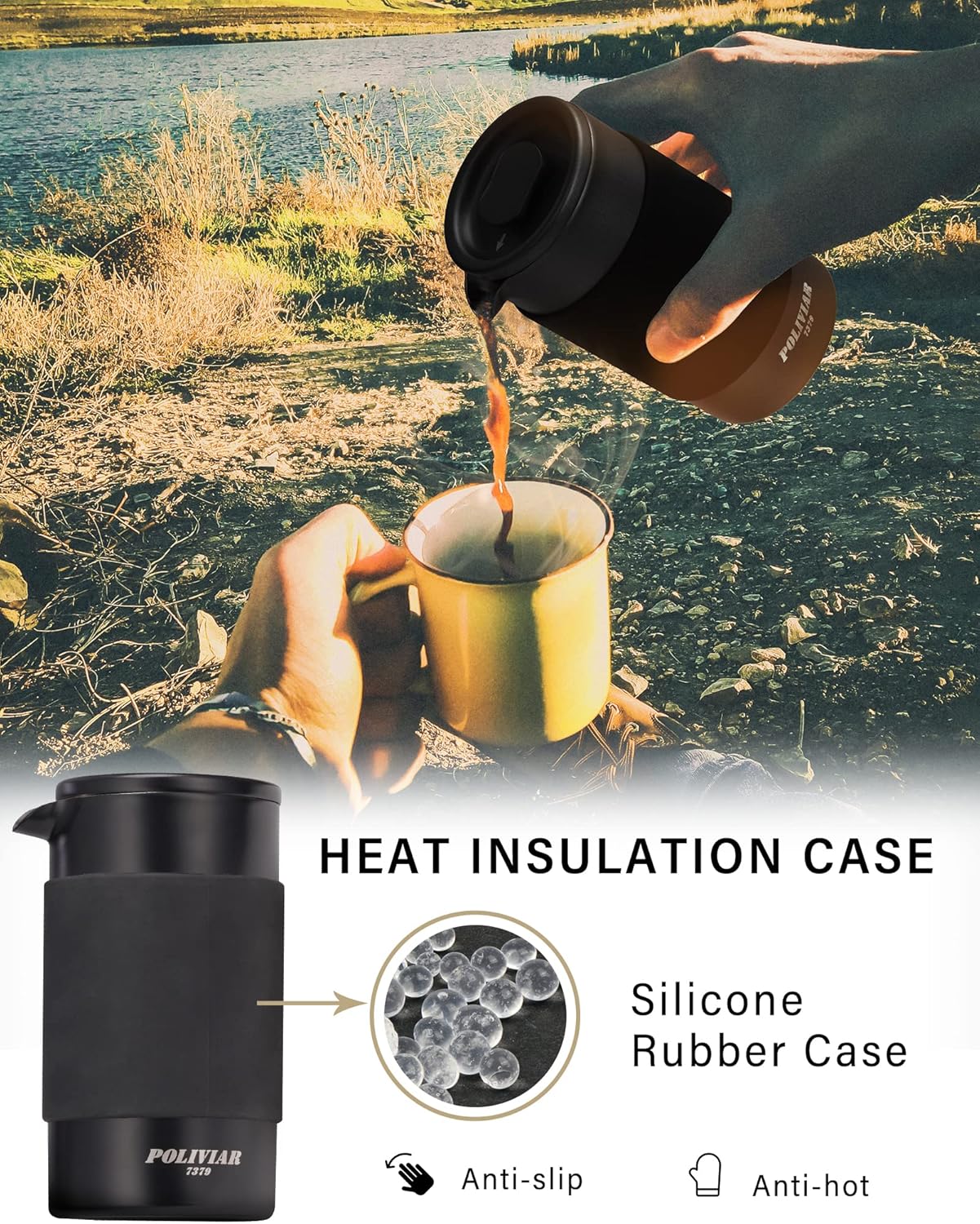 POLIVIAR French Press Coffee Maker, 12 oz Portable French Press with Mini Canister and Collection Bag, Double Wall Insulation & Dual- Filter Screen, Food Grade Stainless Steel for Coffee