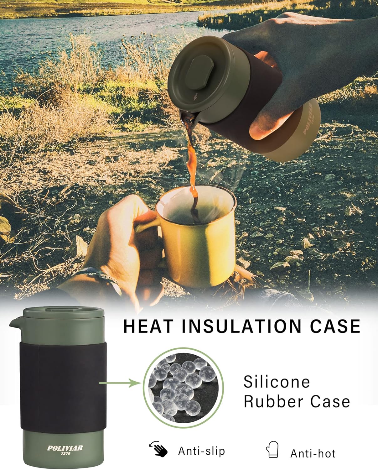 POLIVIAR French Press Coffee Maker, 12 oz Portable French Press with Mini Canister and Collection Bag, Double Wall Insulation & Dual- Filter Screen, Food Grade Stainless Steel for Coffee