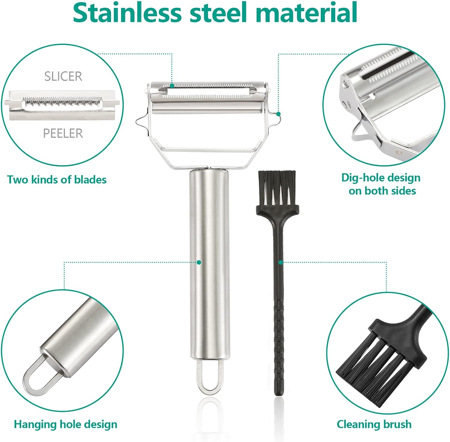 - DUAL SHARP BLADE – The stainless steel peeler made of two kinds of high quality stainless steel razor-sharp blades with anti-cut design which can peeling and slicing fast and safely.