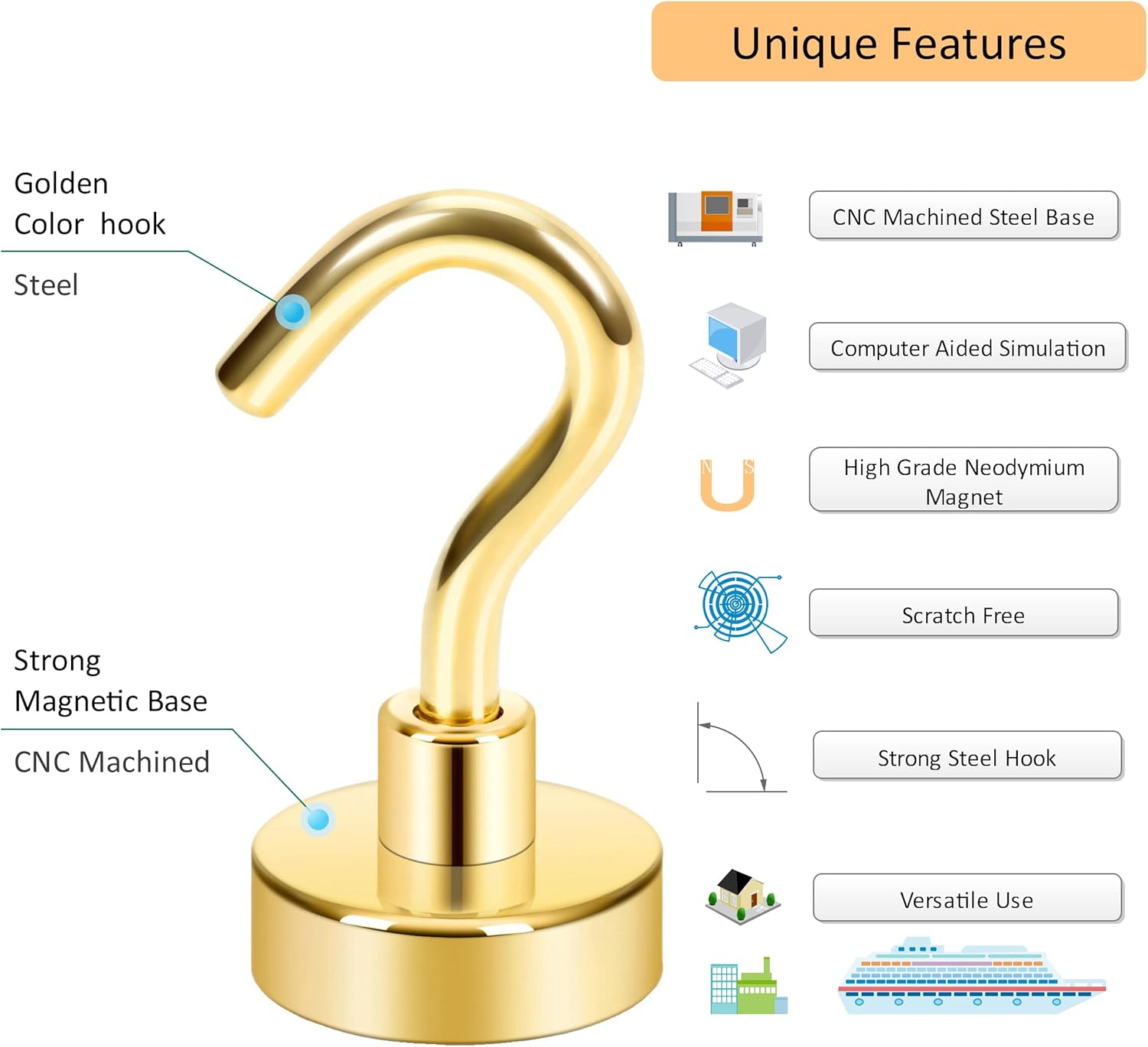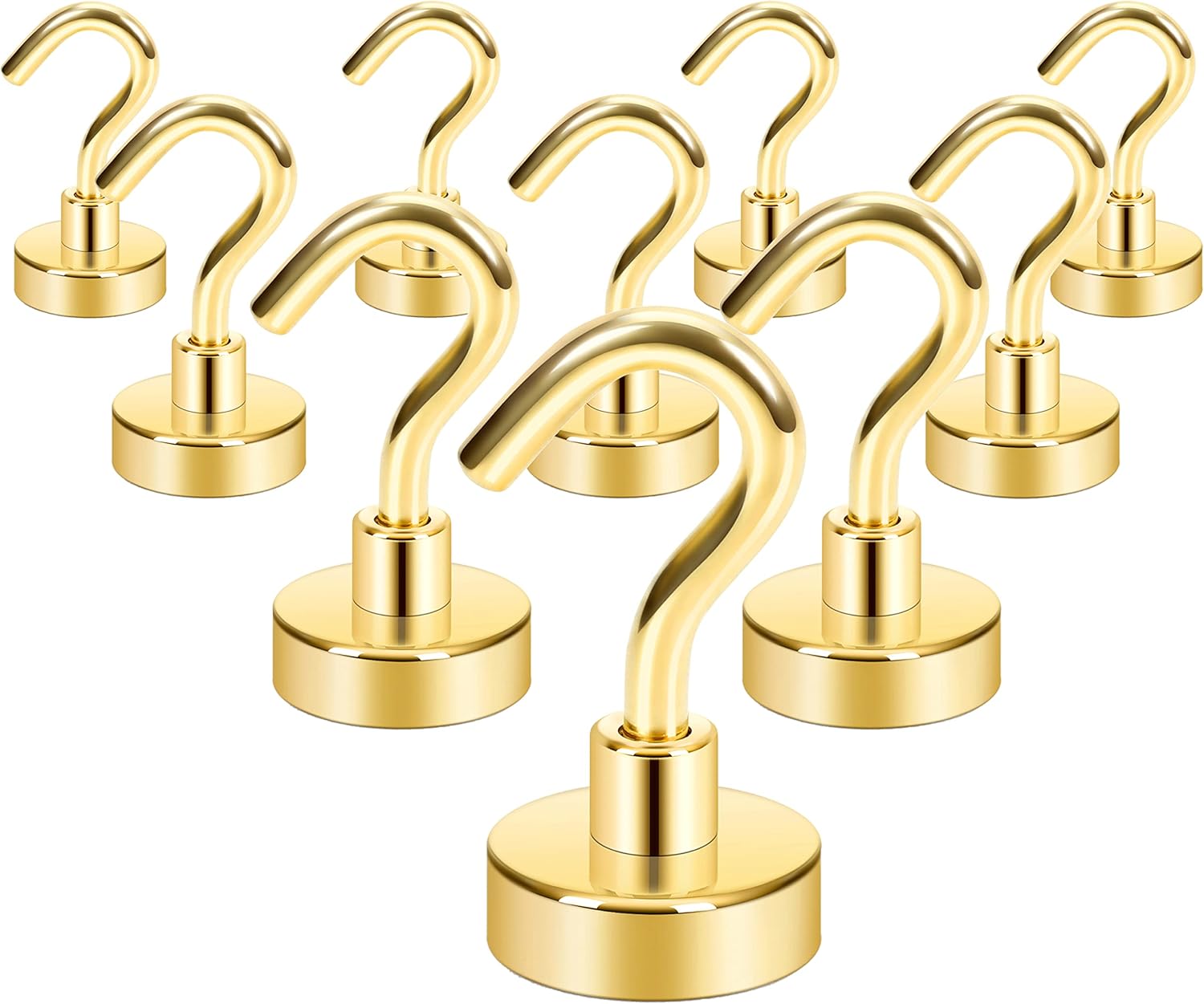 Neosmuk Magnetic Hooks,30lb+ Heavy Duty Earth Magnets with Hook for Refrigerator, Extra Strong Cruise Hook for Hanging, Magnetic Hanger for Cabins, Grill (Golden, 10 Pack)