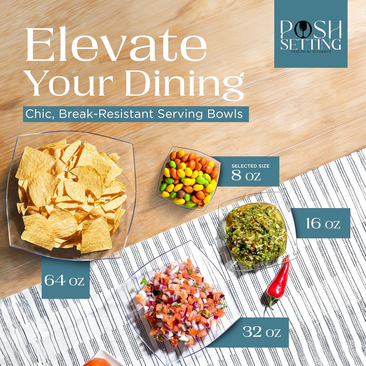 Posh Setting - Clear Plastic Serving Bowls for Party (8oz - 4 Pack) Square, Disposable, Salad & Fruit Bowls for Party Table, Candy Containers for Candy Buffet