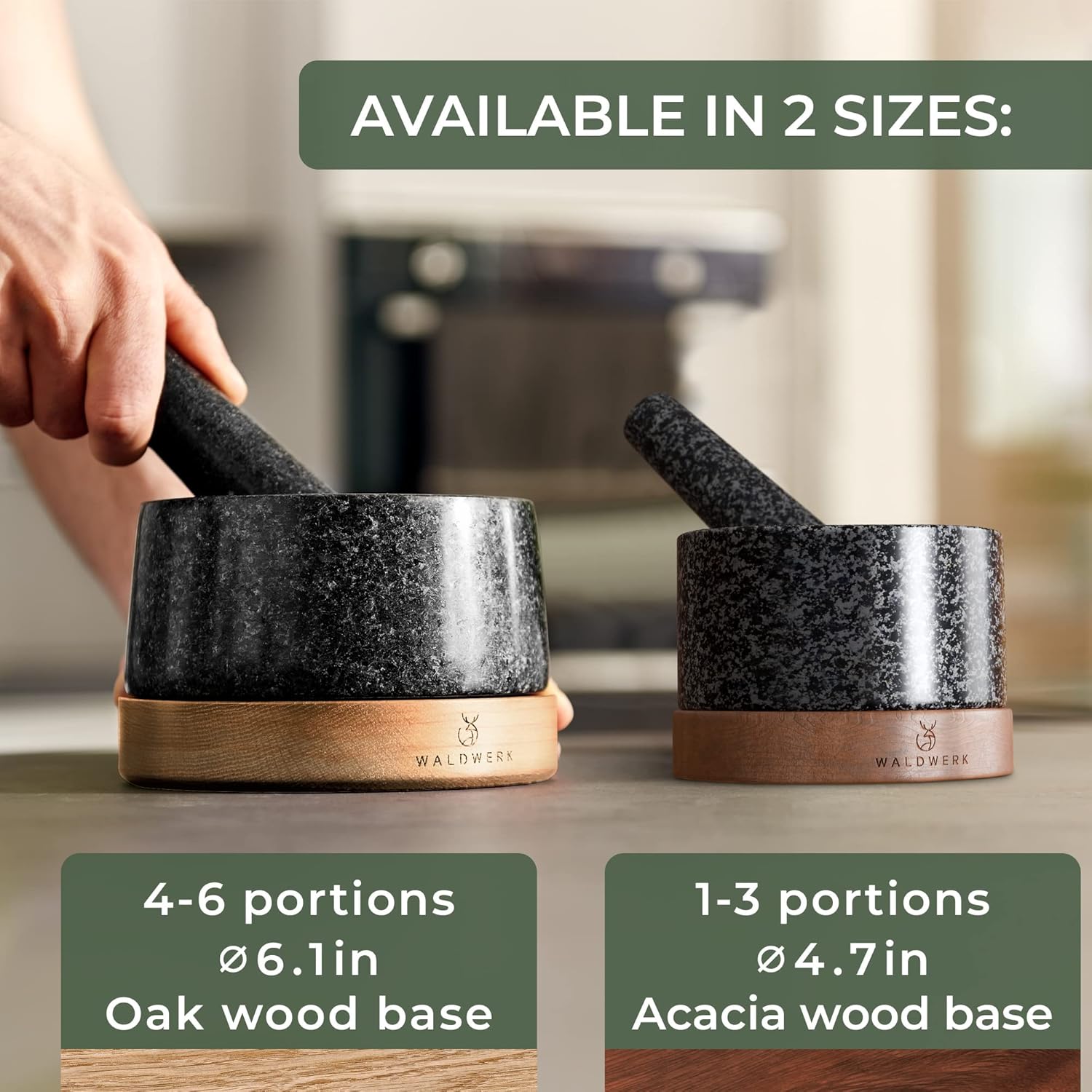 WALDWERK Mortar and Pestle - Mortar and Pestle Set with Anti-Scratch Acacia Wood Base - Mortar with Extra Large Pestle Out of Natural Granite - Large Mortar and Pestle - Perfect for Guacamole