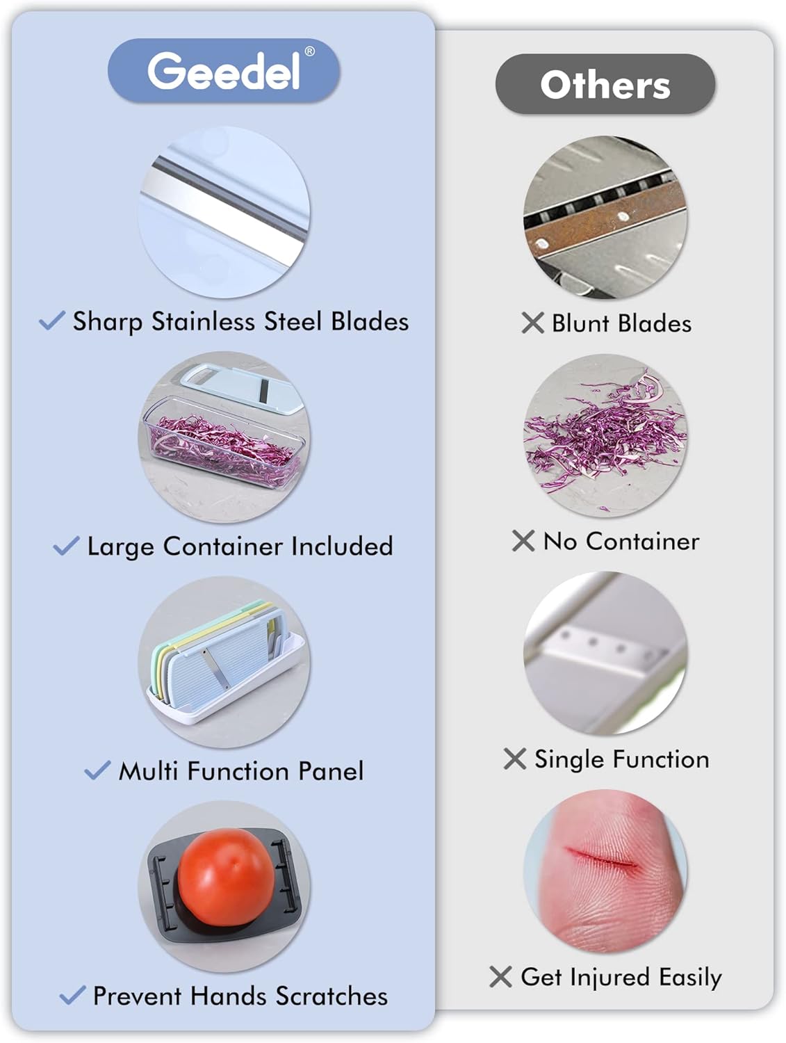 - No More Messing Up : Our potato slicer with a transparent container itself, make it easier to pick up the food we slicing/shredding, but also helps collect our blades well inside at usual. No hunting through your kitchen drawer for your favorite blade