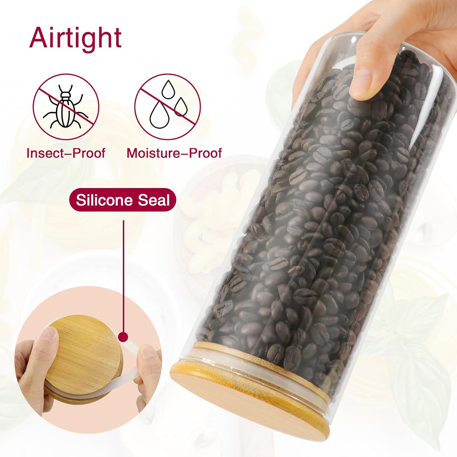 - 【Airtight &Moistureproof】These food storage jars utilize precision bamboo lid with silicone rings to create an airtight seal. The moisture-proof glass storage jars with bamboo lids effectively block ants while preserving freshness in kitchen food jars & canisters.