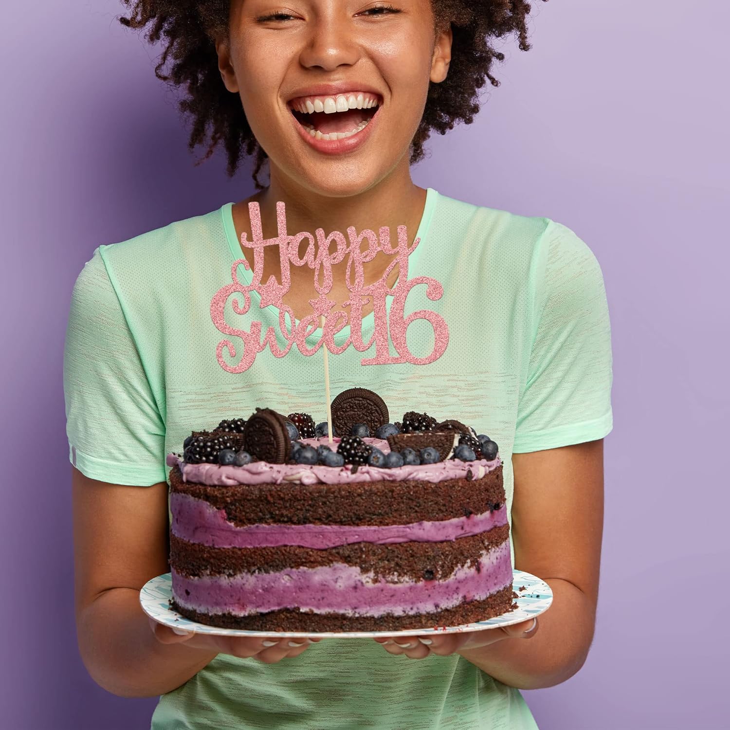 Gyufise 1Pc Happy Sweet 16 Cake Topper Rose Gold Glitter Sweet 16 Birthday Decorations Happy 16th Birthday Decorations for Girls Boys
