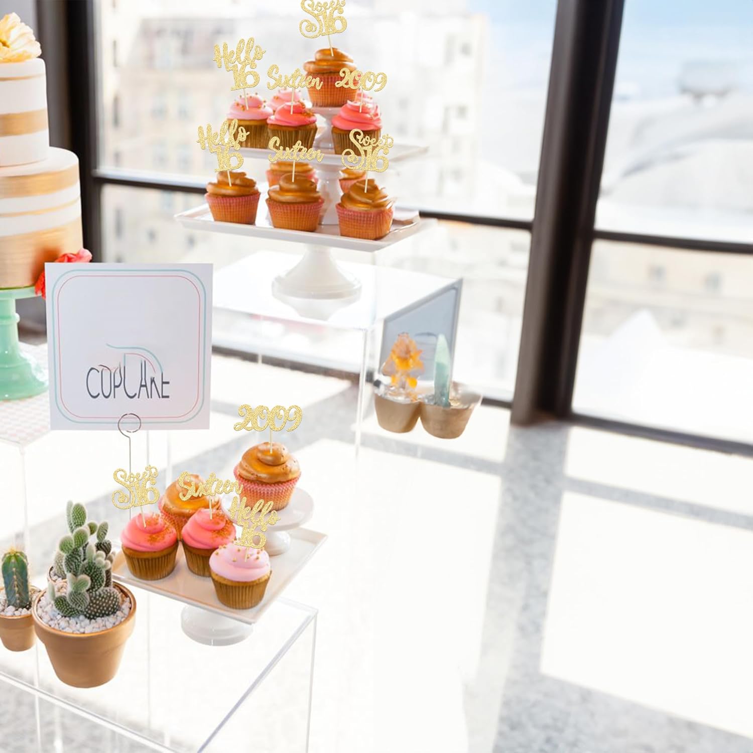 Gyufise 24pcs Sweet 16 Cupcake Toppers - Gold Glitter, Hello 16, Cupcake Picks, Cake Decorations for 16th Birthday Party Supplies