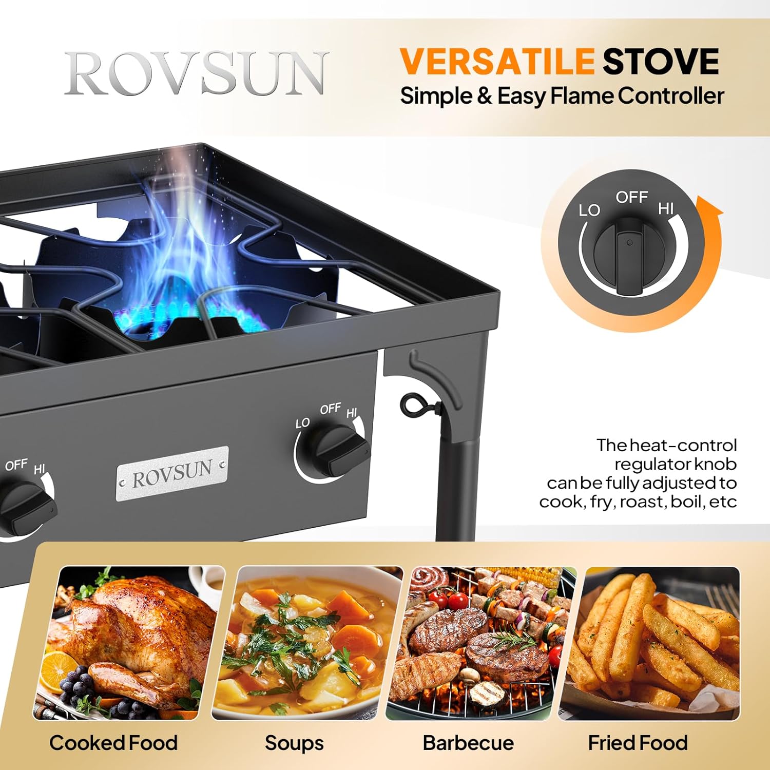 - 225,000 BTU ★ Stove give off a strong flame that can be adjusted easily. Heat is controlled by a CSA approved regulator, which is more safety and longer working time. Three burner make it possible to cook more food at the same time, 75,000 BTU for each burner.