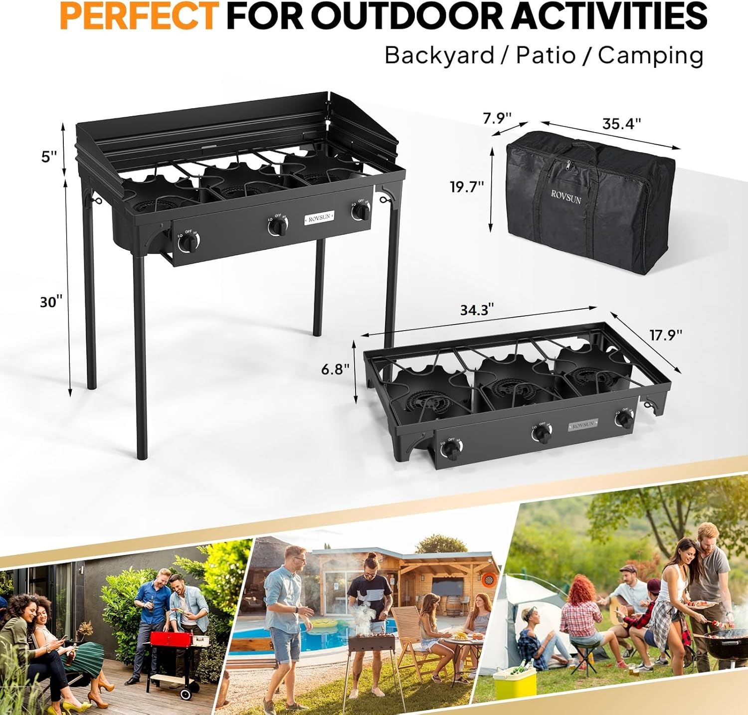 - SIMPLE ASSEMBLY & STORAGE ★ Put together 4 legs & windscreen, then hook it up with propane gas, then you get an awesome extra cooker. Top working measures 34.3’’ long 17.7’’ wide. Extra Carrying bag for convenient carrying out and storage! (Gas tank IS NOT included.)