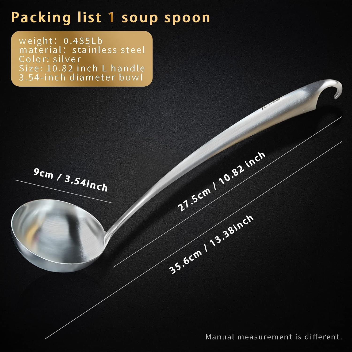 - 🍨【FOOD GRADE MATERIAL】: Before producing this stainless steel soup ladle, our designers carefully planned. Because the soup ladle will be in contact with food for a long time, the material we must use food-grade 18/10 stainless steel, which is processed, ground and polished several times to finally become mirror finish. Compared with other cooking spoons in the market, our soup spoons do not rust, rot, discolor or have no odor.