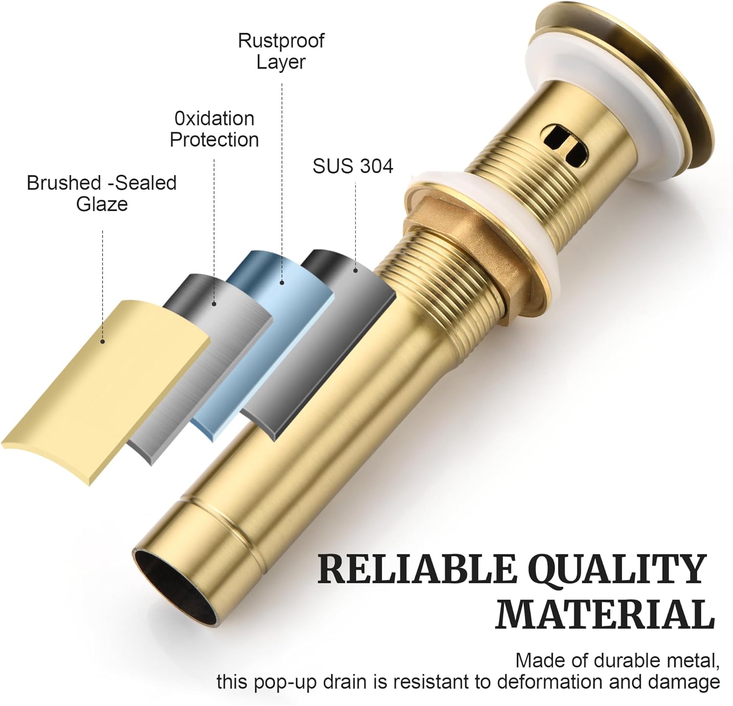 Pop up Sink Drain Stopper with Overflow Brushed Gold for Bathroom Vessel Vanity Sink Art Basin, Big Cap Sink Drain with Overflow, Metal Pop-up Drain Strainer with Detachable Basket Stopper