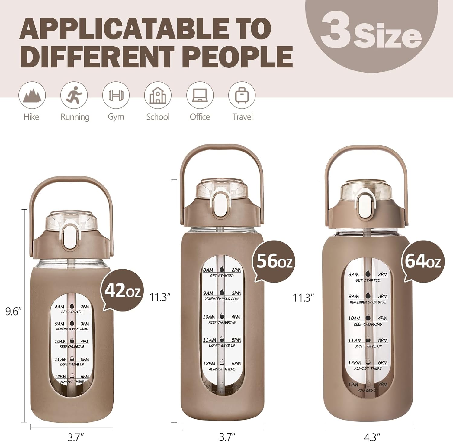 - ❤Glass Bottle With Time Marker- Time markers and water capacity markers on the glass bottles. Great for measuring your daily intake of water and a reminder to drink the perfect amount of water each day. 64 oz water is equivalent to 8 cups of water recommended by scientists for humans every day, this motivational water bottle lets you not refill it frequently anymore.