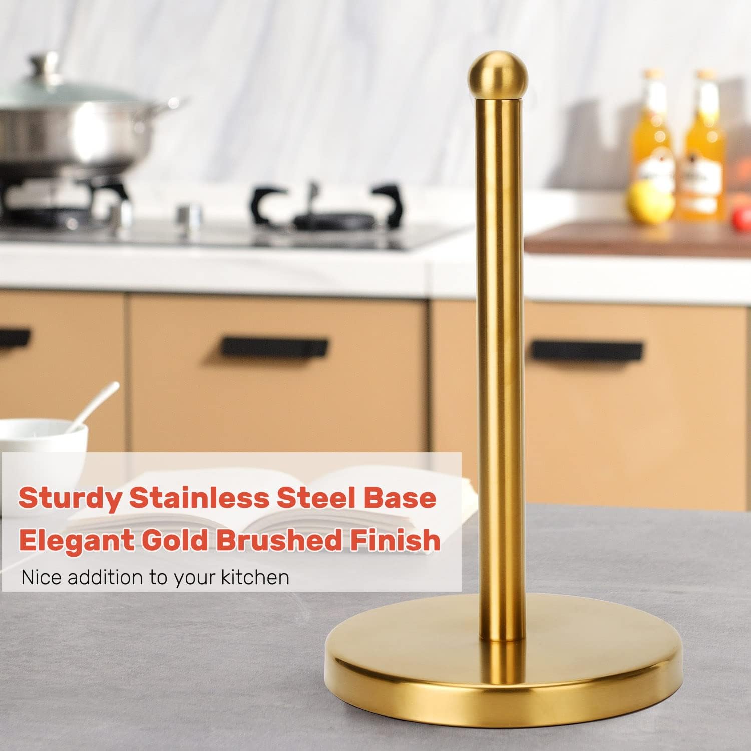Gold Paper Towel Holder, Easy One-Handed Design for Kitchen Stand Paper Towel Dispenser, Sturdy Base for Standard Paper Towel Rolls and Mega Paper Towel Roll (Gold - Stainless Steel Base)