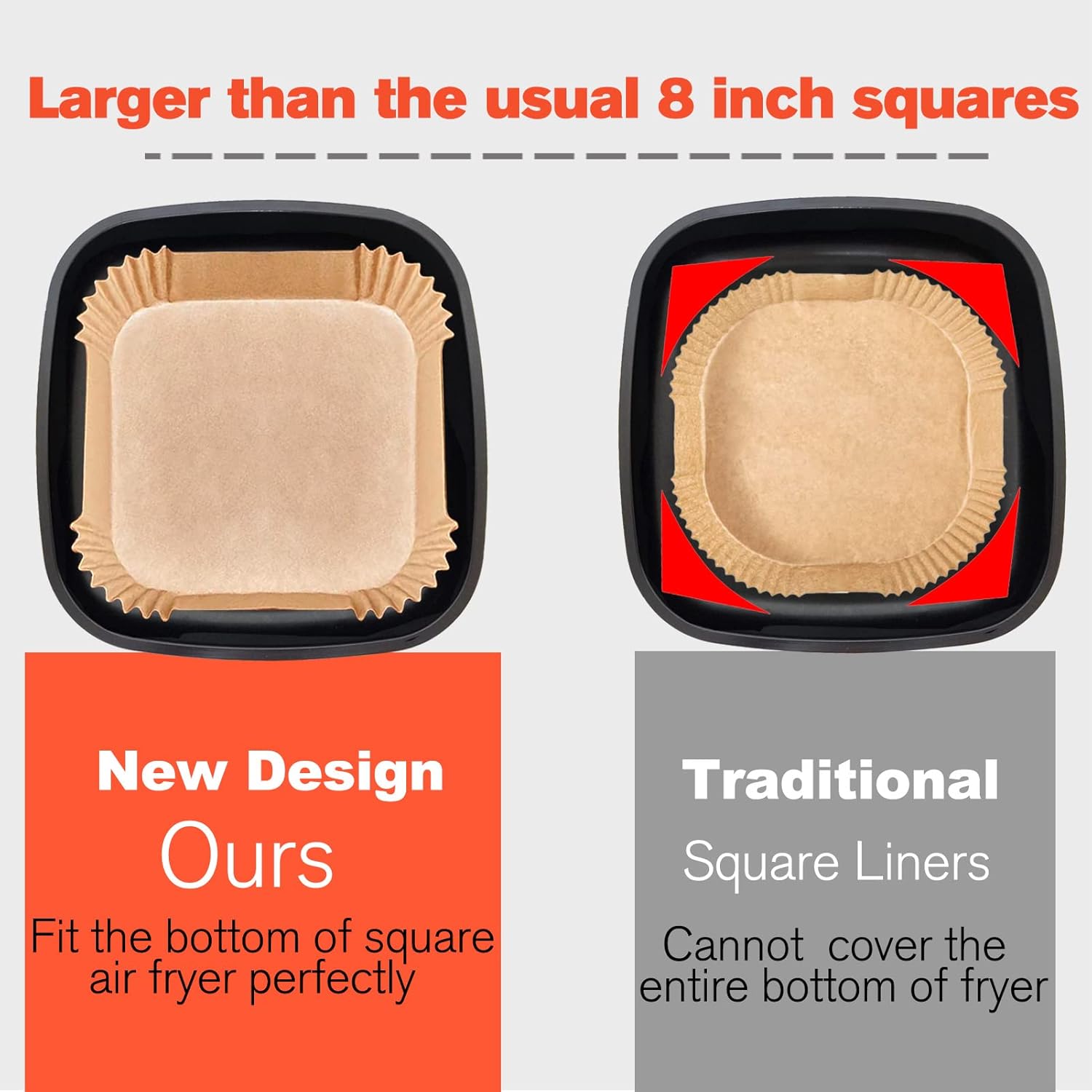 - 【Info】Large Size. 100Pcs. Square bowl shape. Upper size 10 inches, bottom size 9 inches, perfects for 8-12 quart air fryer. PLEASE MEASURE YOUR AIR FRYER BASKET BOTTOM BEFORE PURCHASE!