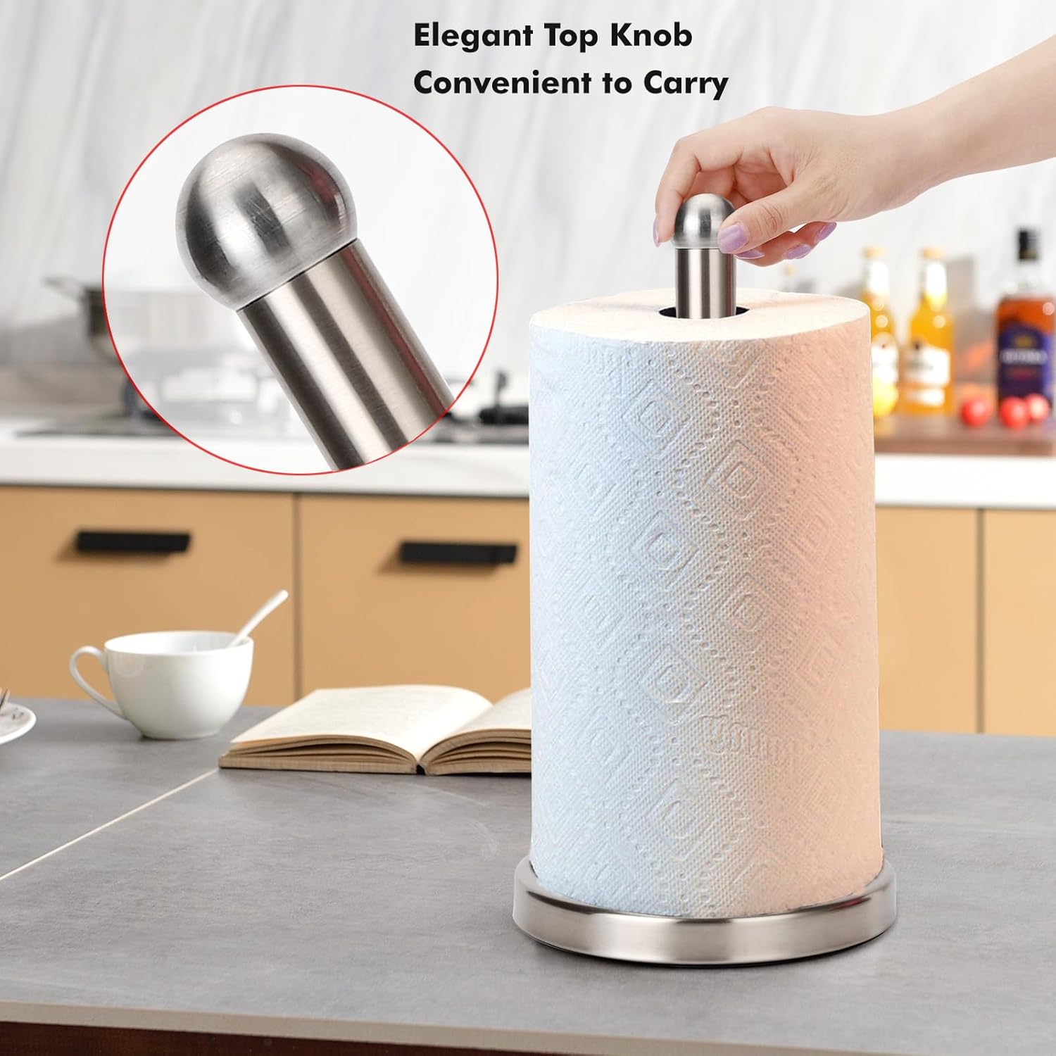 - Elegant Round Top Knob for Easy Carrying. Free standing paper towel holder can stay where it needed most any time. No drilling, and space saving, just grab the knob and put on the countertop.