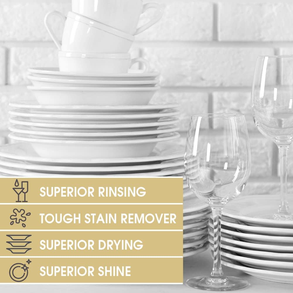 - Superior Drying & Shine: Incredible results vs. using detergent alone. Dishes, glasses, plasticware and flatware never looked so good.