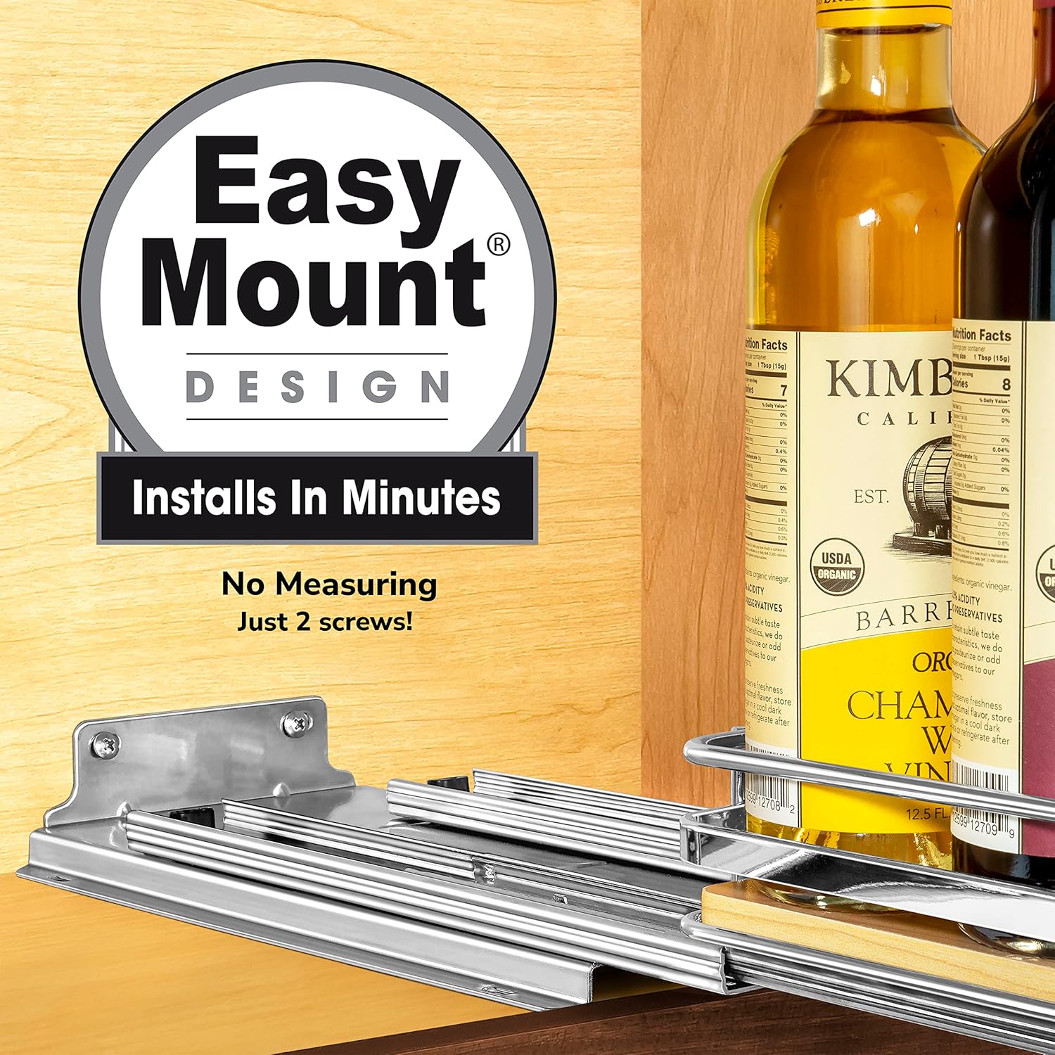 - SETUP IS A BREEZE! – no struggling within limited space trying to place four awkward and difficult to reach screws inside your upper cabinets or into pantry shelves – our exclusive EASY MOUNT cabinet friendly drawer design installs with just two screws in the easily accessible back of your narrow cabinets – in minutes with no measuring!