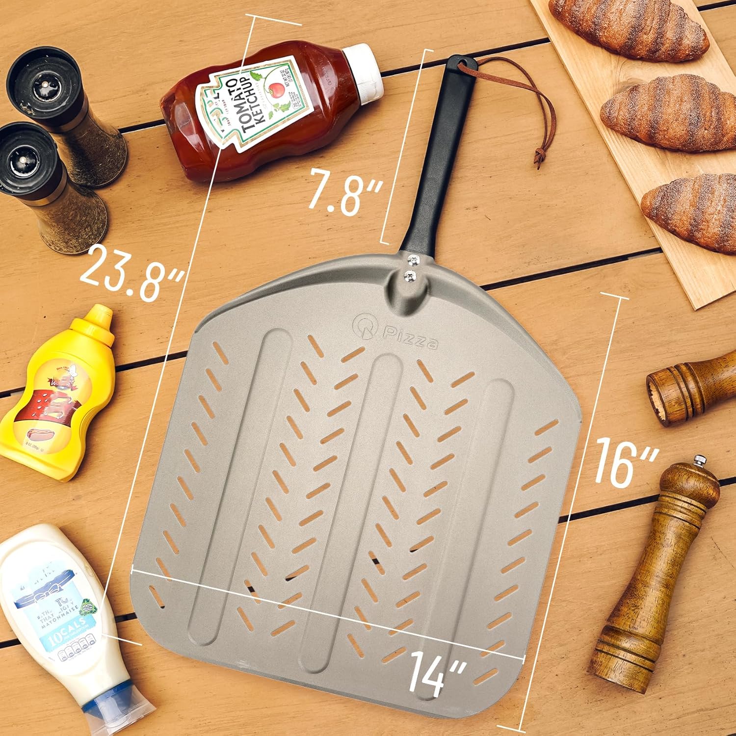 Q Pizza Perforated Pizza Peel 14", Non-stick Pizza Turning Paddle Pizza Oven Accessory, Extra Large Metal Pizza Spatula for Grill Oven Baking Bread Pastry Dough Pie Cake, Aluminium PT204