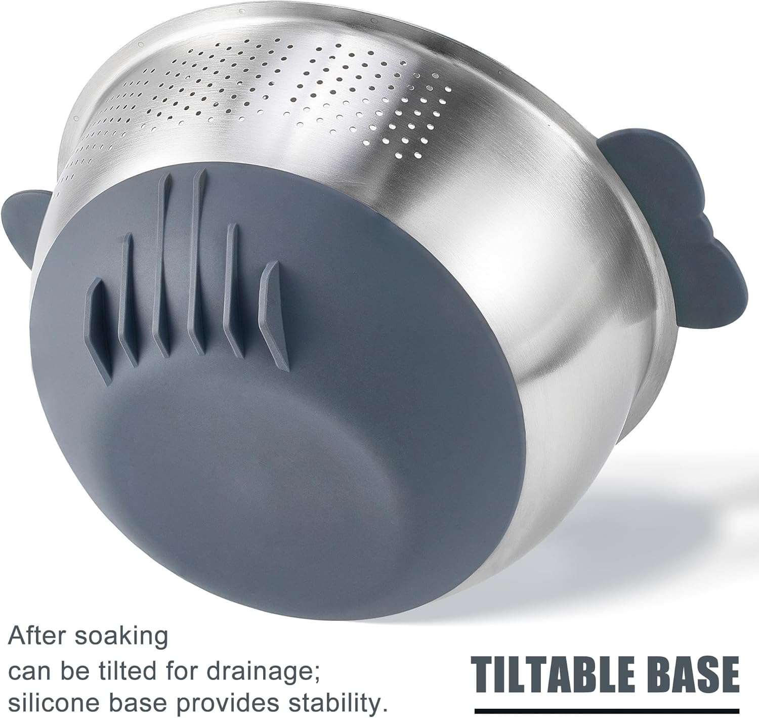 Rice Washer Strainer Bowl Quinoa Washing Bowl 18/10 Stainless Steel Colander Versatile Good Grips Side Drainers for Cleaning Rinsing Fruits, Vegetables, and Beans - Tilting Non-slip Silicone Bottom