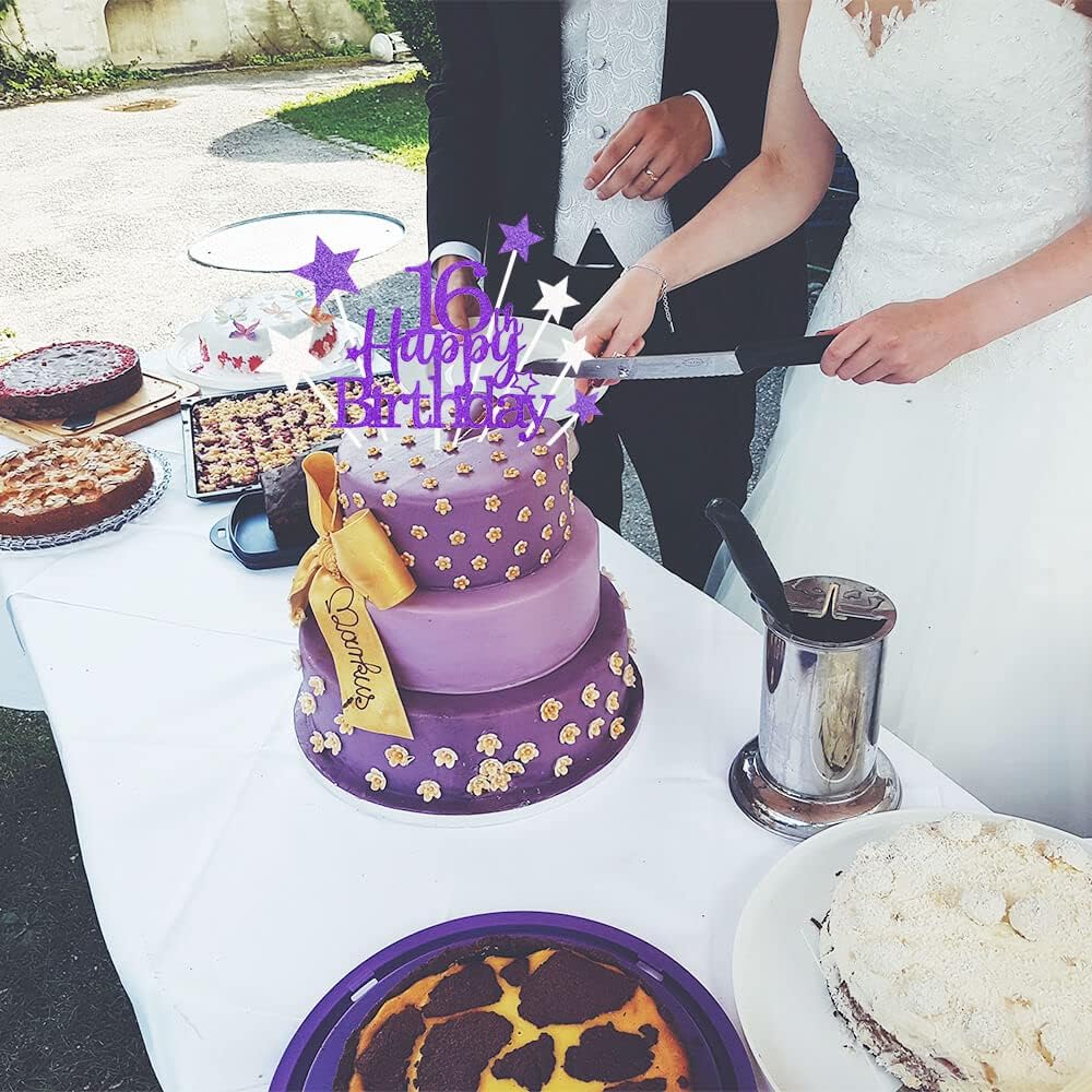 Glittery 16th Happy Birthday Cake Topper with Star,Personalised 16 Birthday Cake Toppers Party Decorations Party Supplies for Boys Girls Purple Silver