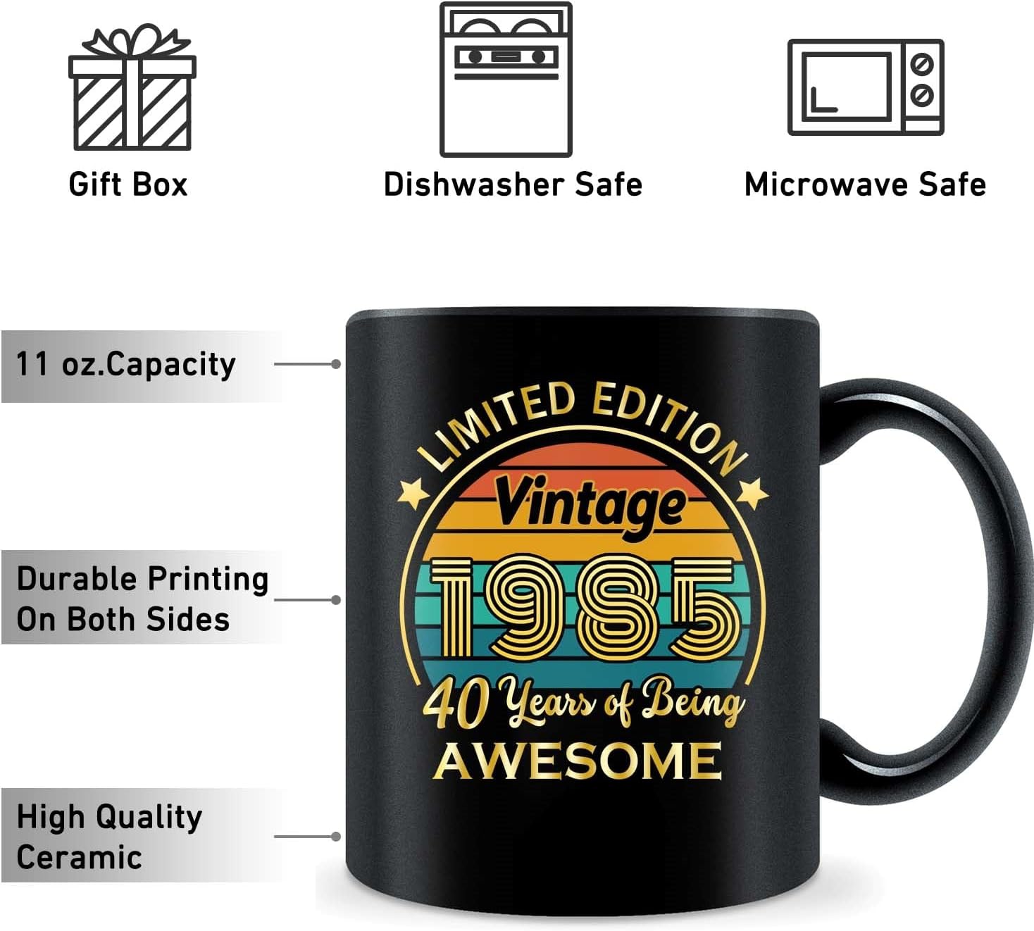 - Best Gifts for 40 Year Old: Commemorate the milestone 40th birthday with this exclusive 1985 vintage-inspired coffee mug. The recipient of this 40th birthday gifts ideas will get a great laugh and enjoy seeing this great design every time they pour themselves a cup of coffee or tea.