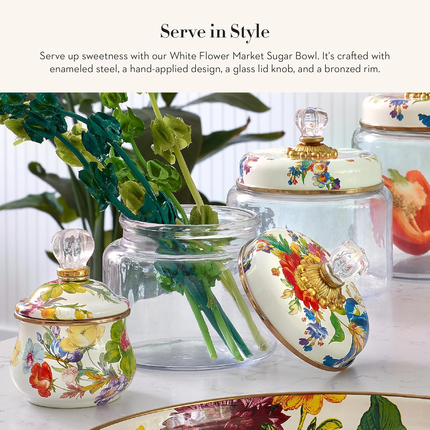 - ELEGANT STORAGE JAR: Spice up your sugar storage with this small sugar jar. It features our Flower Market pattern with glossy hand-applied floral transfers on enameled steel. The lid is topped with a clear decorative knob for an extra touch of elegance.
