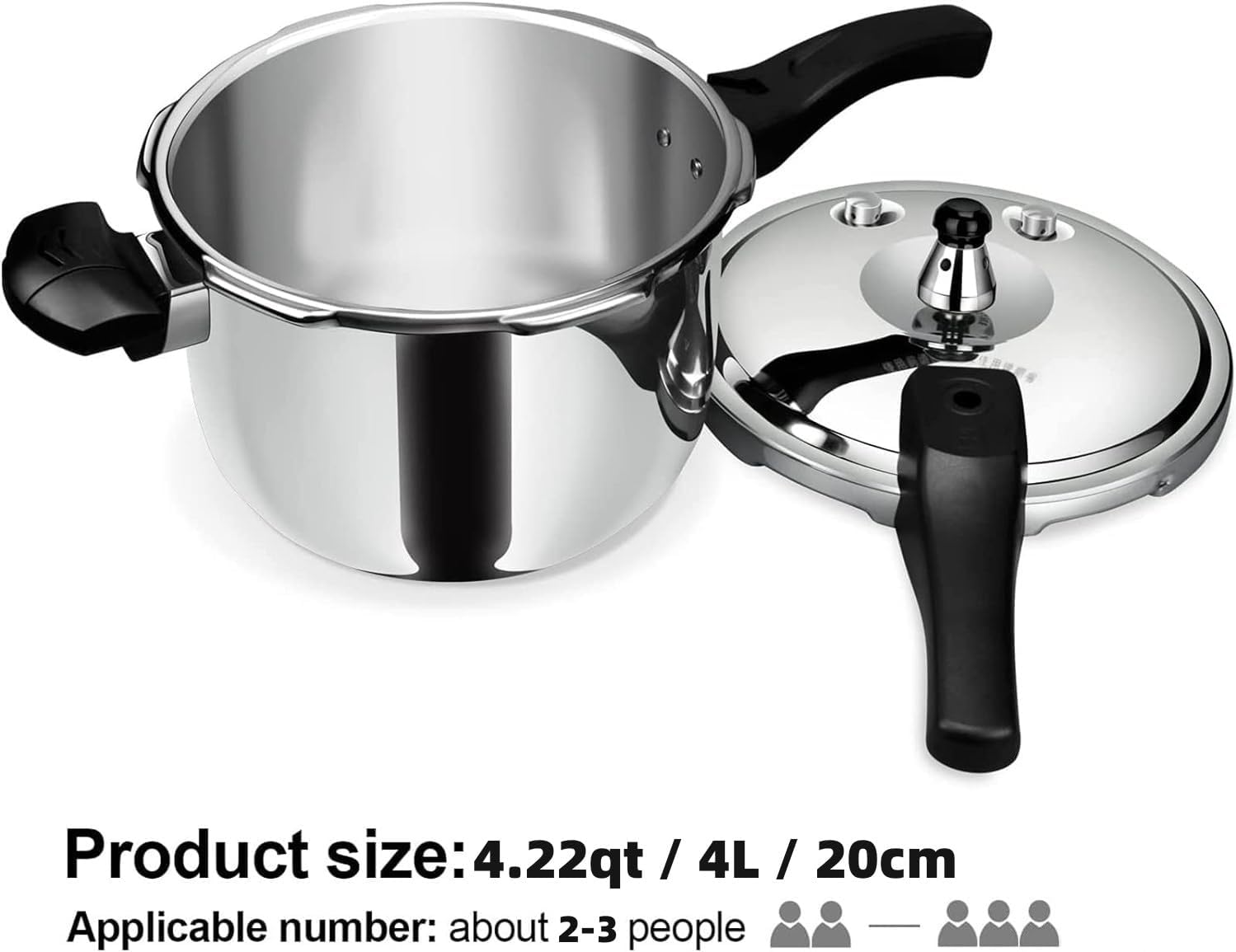 - β [Crafted from top-grade stainless steel and durability]-Our Stainless Steel Pressure Cooker 4 quart guarantees food safety and prevents any harmful reactions with your ingredients. Keep all the nutrients and flavors intact the healthier way! 4.22qt pressure cooker boasts quality stainless steel components and ergonomic handles for rust resistance and heat endurance.
