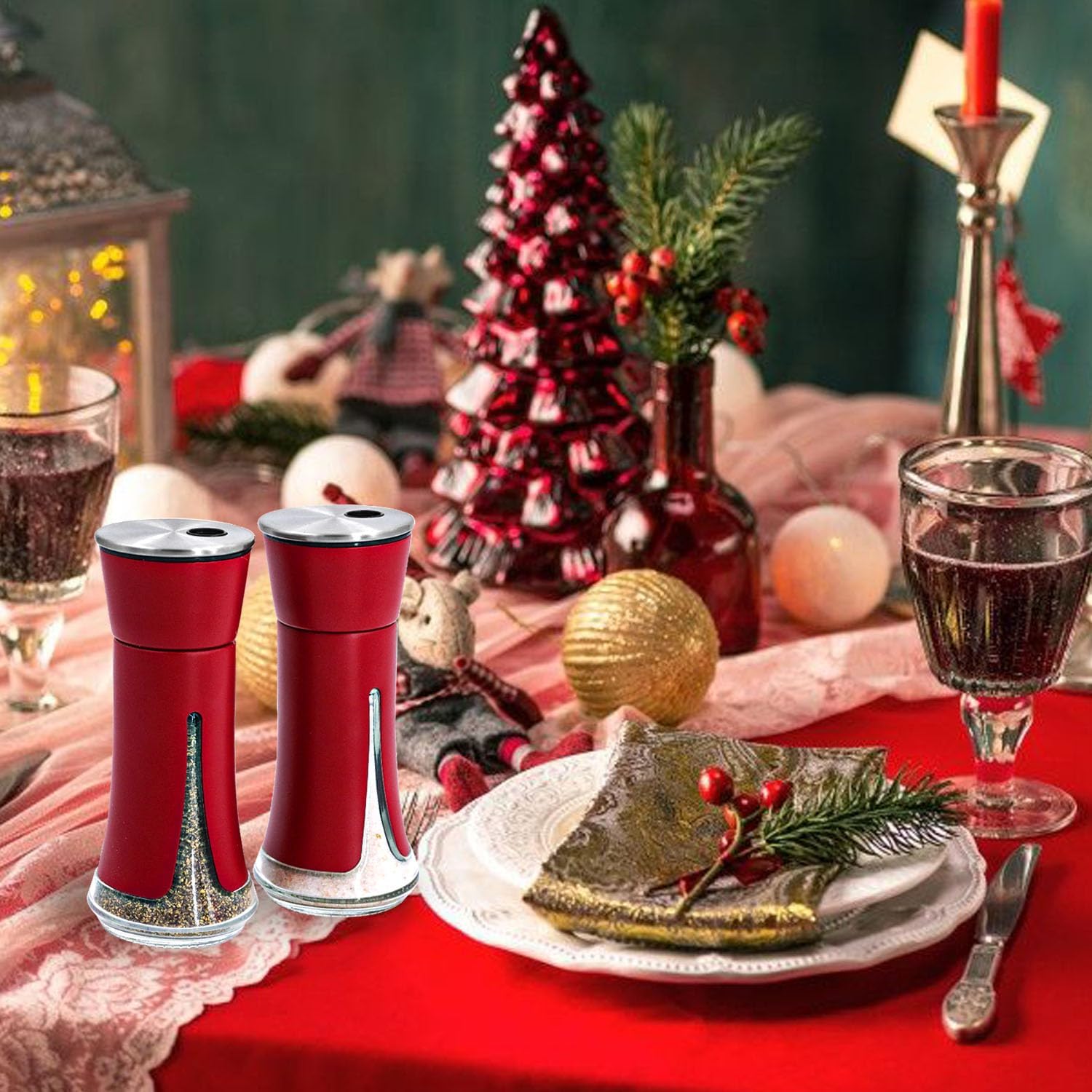 - ADJUSTABLE POUR HOLE SETTINGS: The red salt and pepper shakers with adjustable holes have a turn dial for different opening sizes. You can control the number of seasonings added to your meal according to your taste, Perfectly adapted to fine and coarse salt.