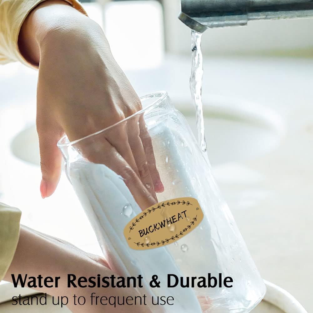 - REMOVABLE & WATERPROOF - Self-adhesive apothecary bottle labels are made of durable waterproof vinyl and applied with premium glue, which will stay on any surface firmly and stand up to daily wash and frequent use, but also can be replaced easily without leaving a nasty residue. Dishwasher and refrigerator safe!