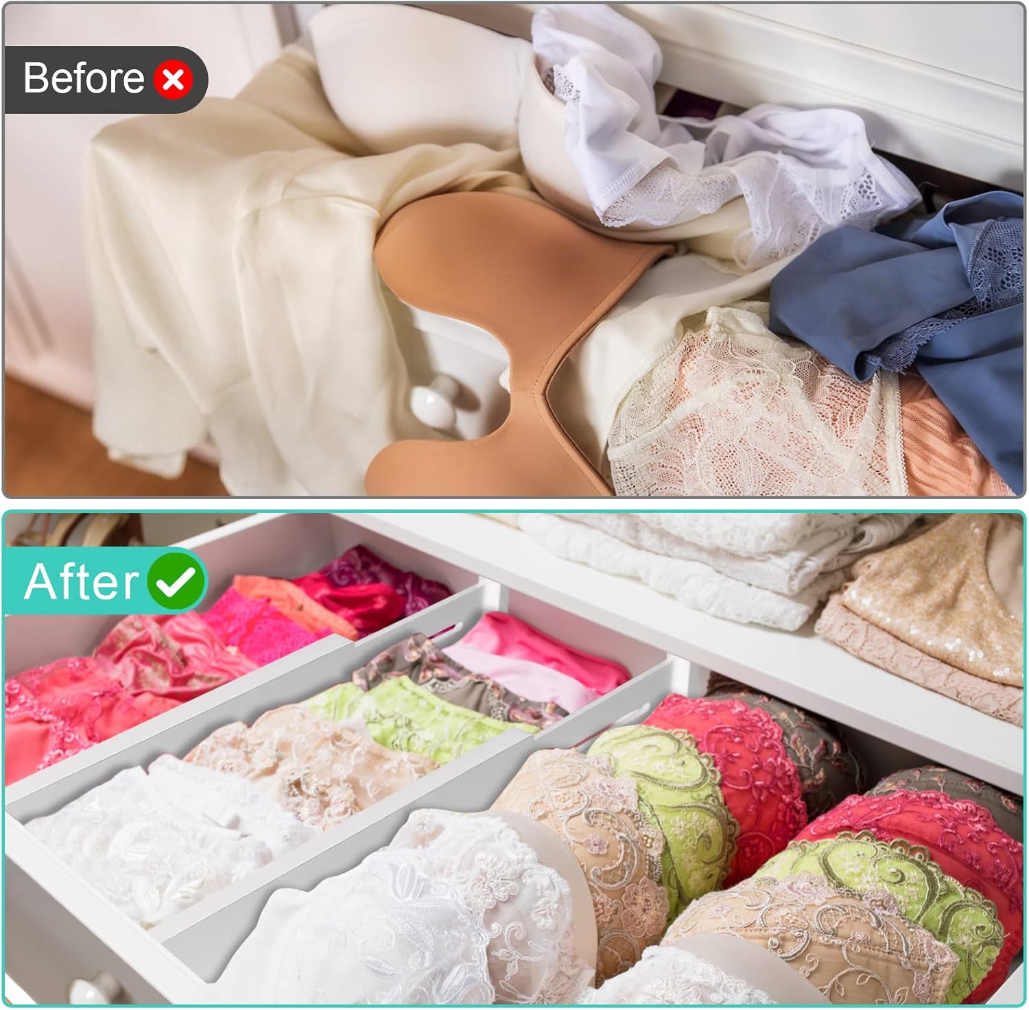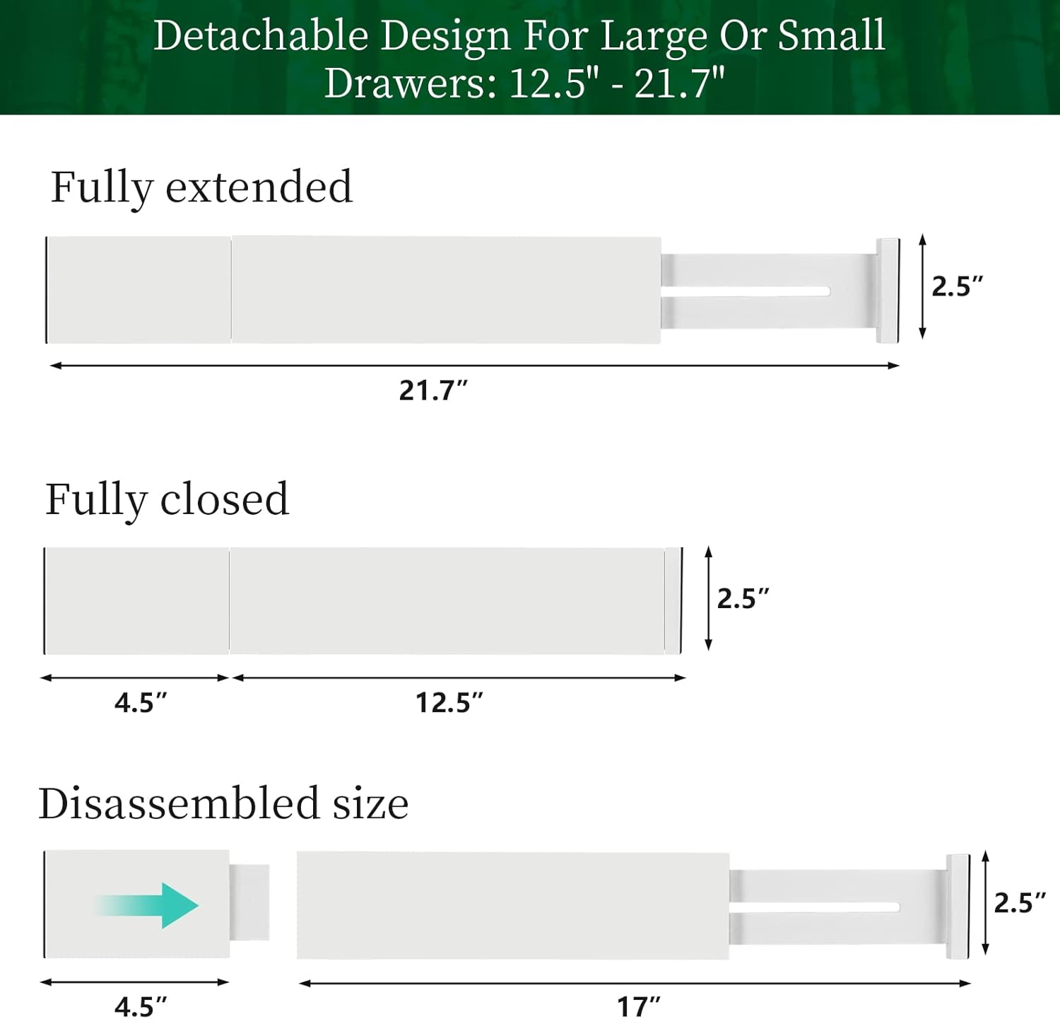 - Adjustable Drawer Dividers: Adjustable drawer dividers range from 12.5-21.7 inches in length; fits easily in most drawers to keep your belongings organized and easy to access