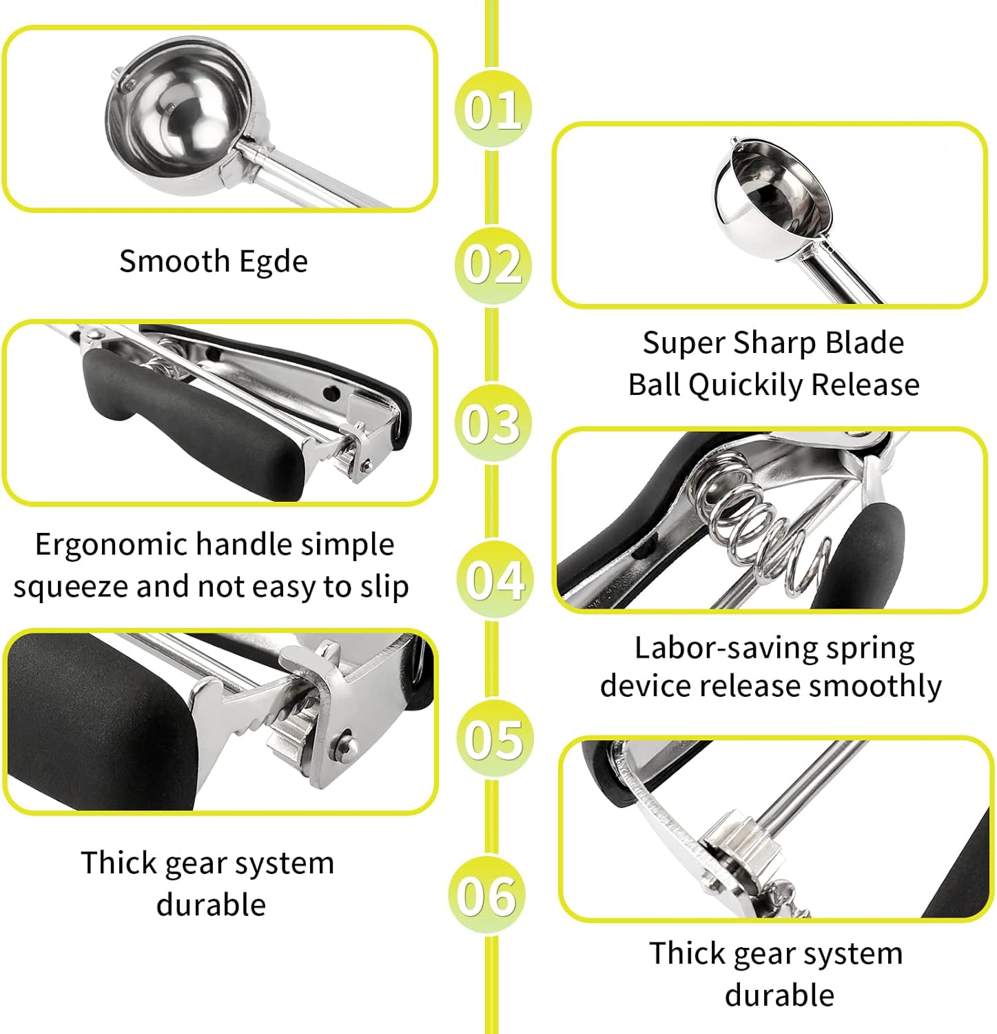 - Durable and Premium: The scoop is made of 18/8 stainless steel, will not rust or corrode, will not chip or fade. You can have confidence in the safety and durability of this kitchen tool. Easy to clean, dishwasher safe, it is recommended to wash your hands to maintain gloss.