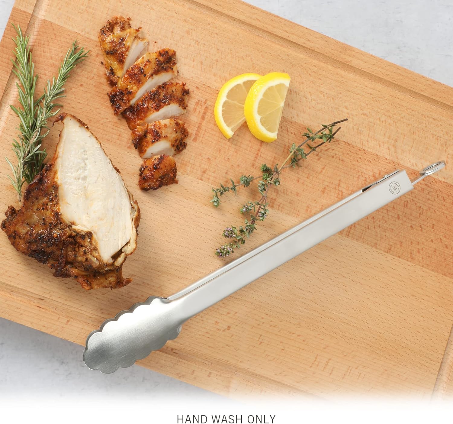- WHAT'S IN THE BOX: One pair of stainless steel tongs (12-inch)