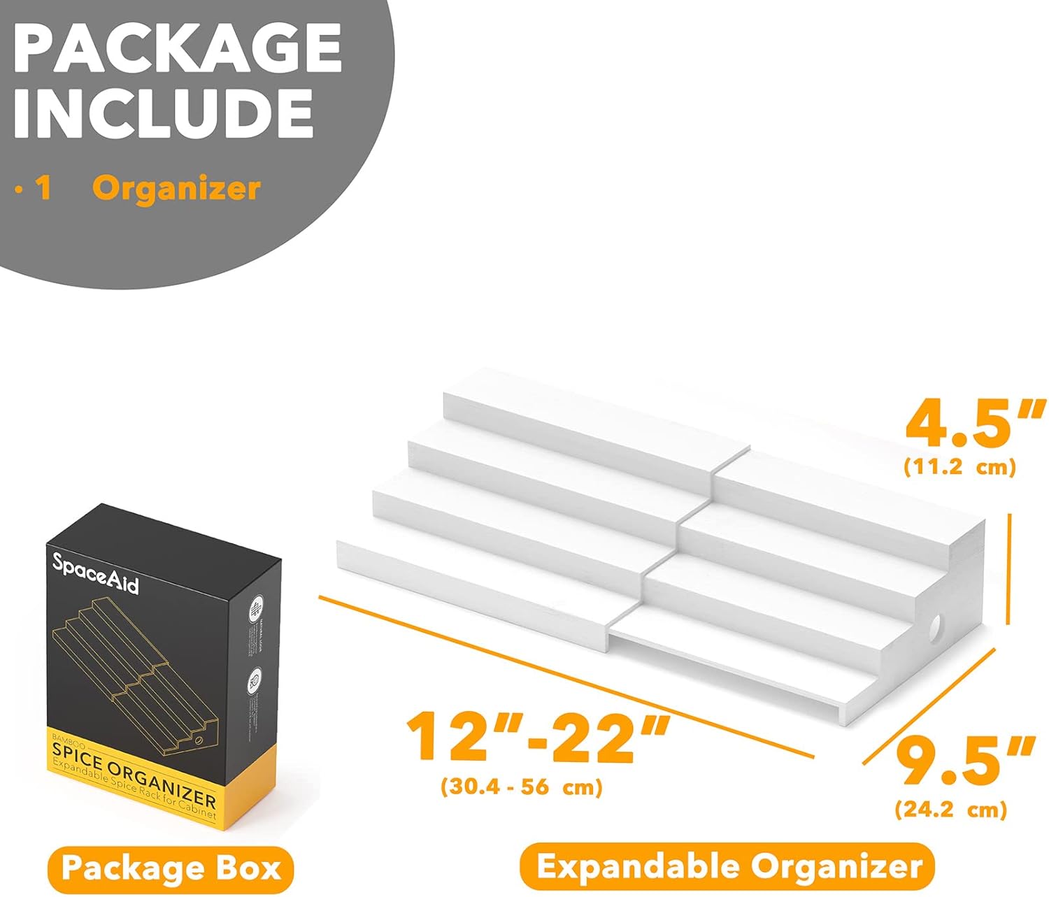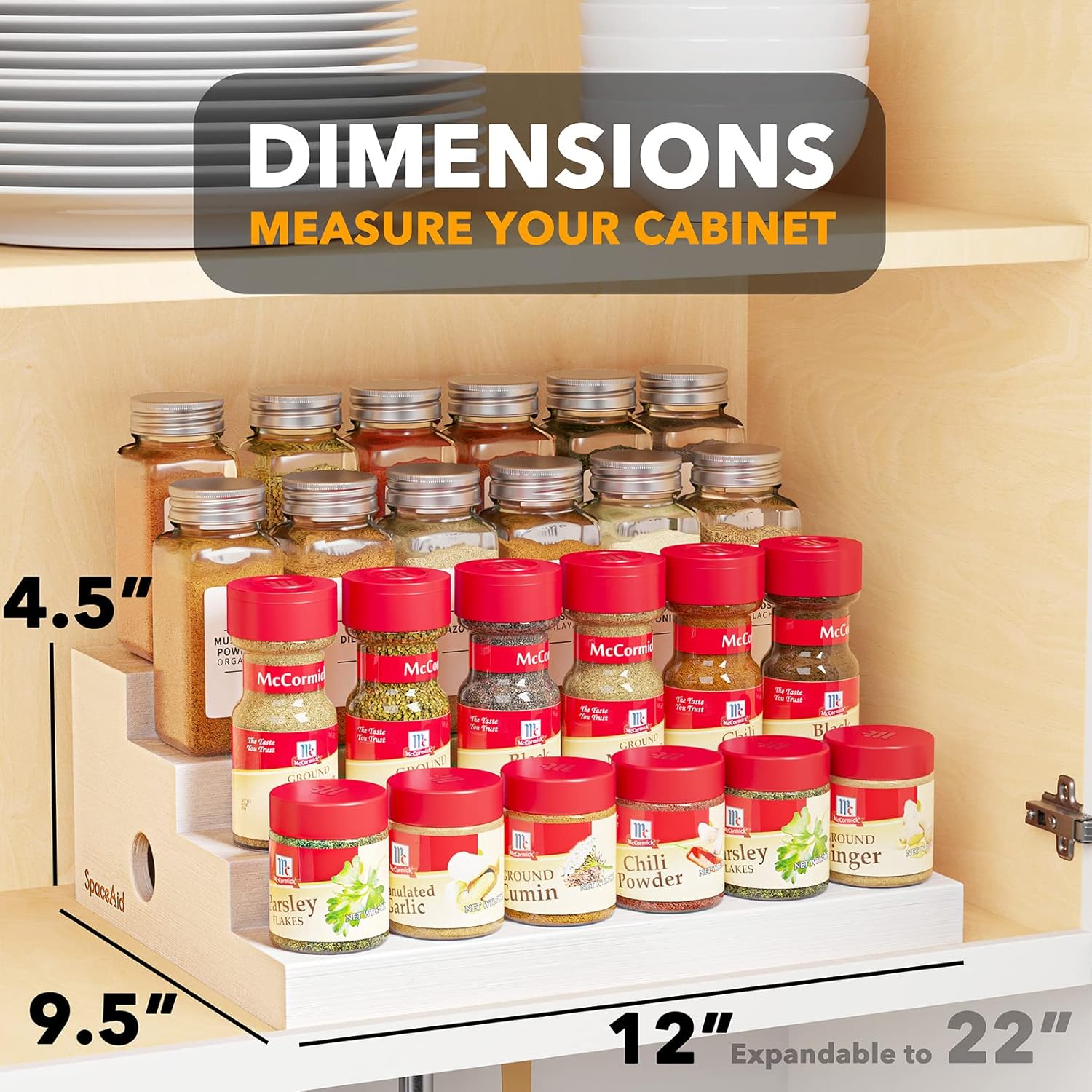 - EXPANDABLE SPICE SHELF - Keep your home clean and keep track of your spice jars better with this bamboo organizer holder; The spice rack is expandable and adjustable from 12" wide to 22" wide