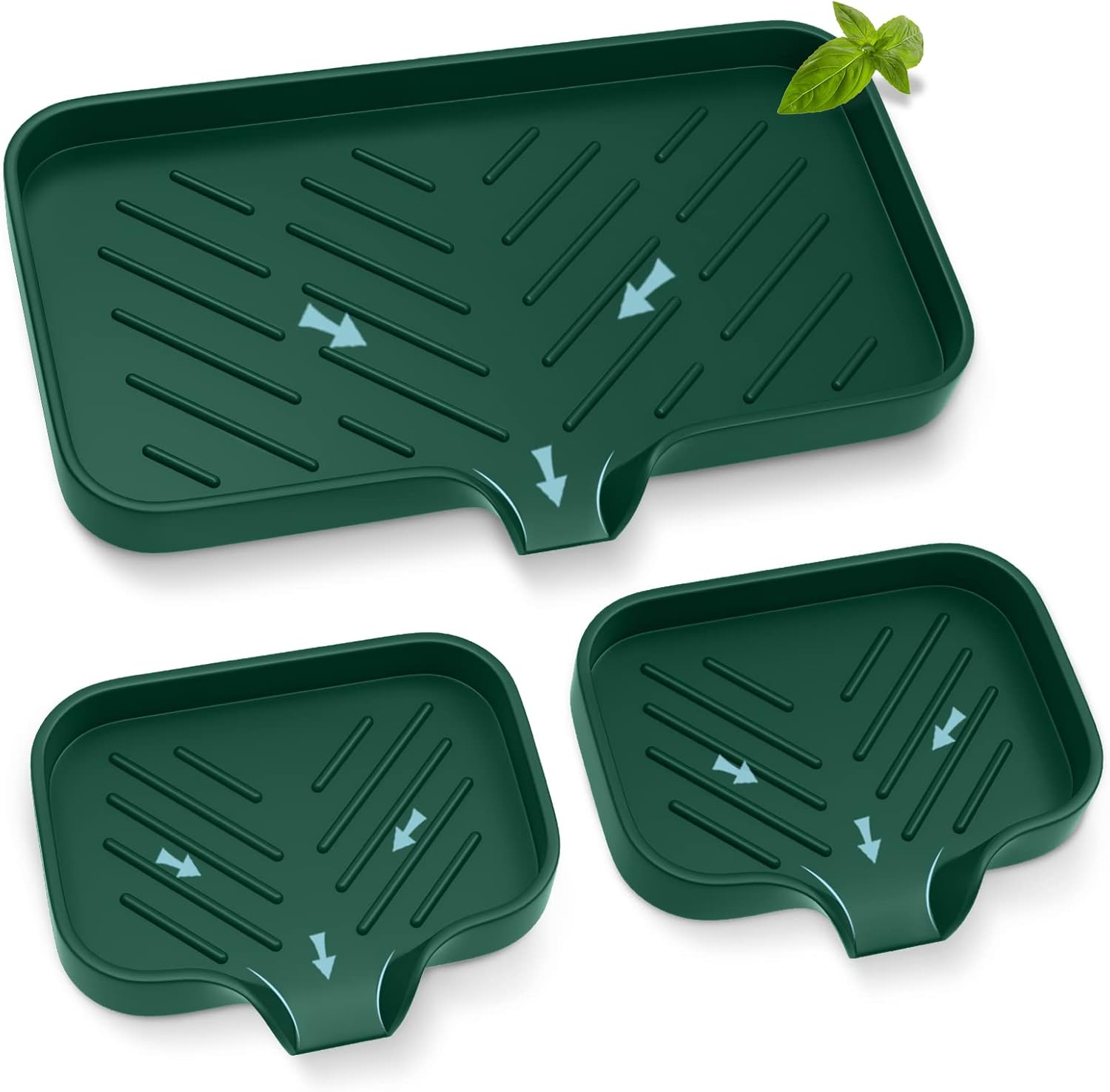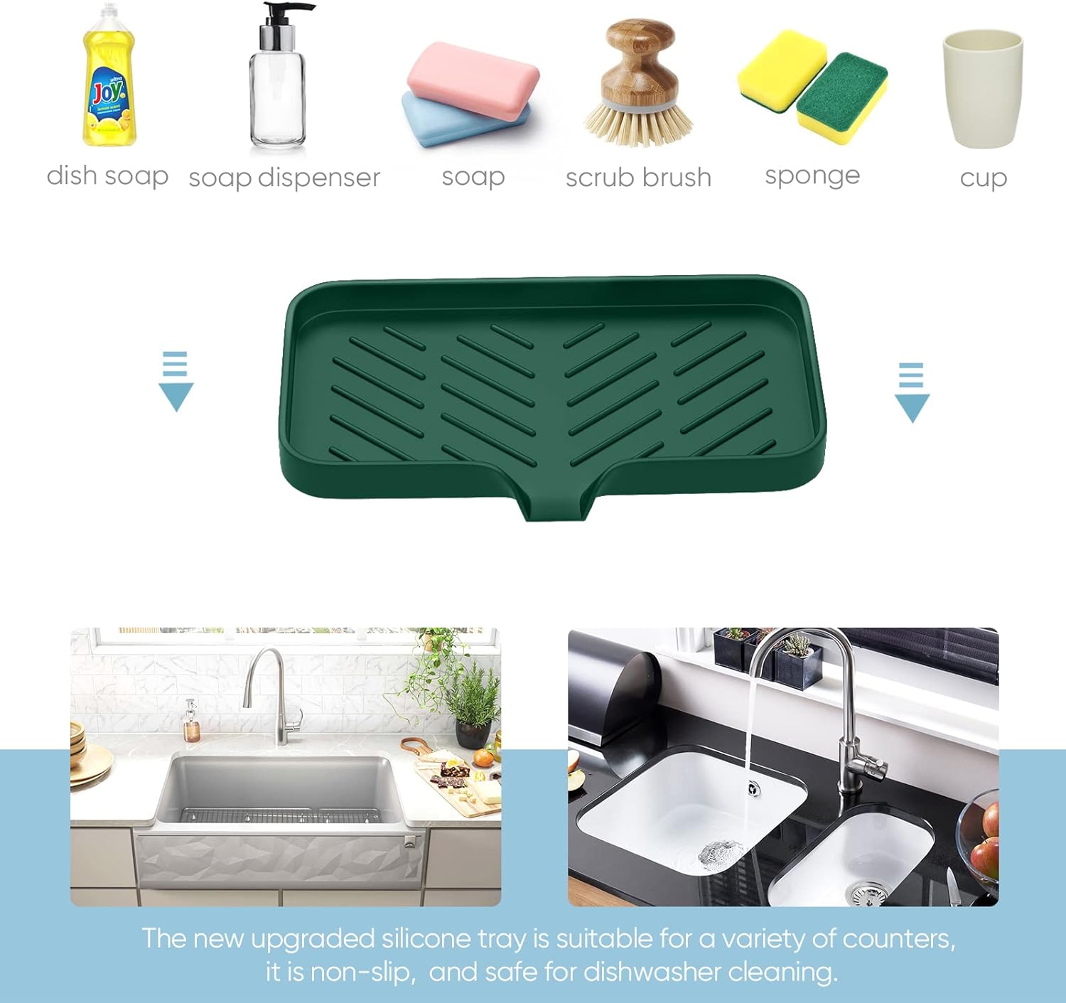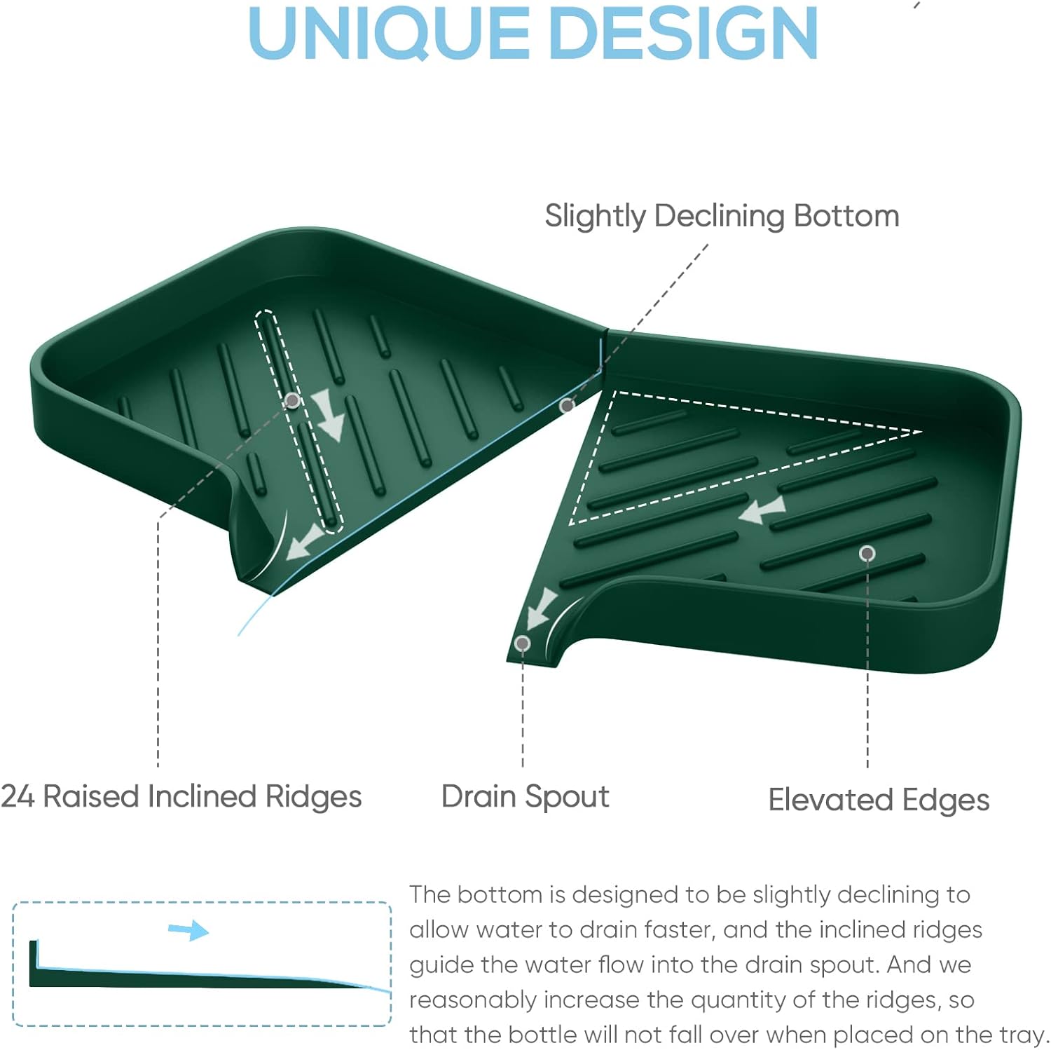 - 【New Upgraded Kitchen Soap Tray】After analyzing the advantages and disadvantages of many similar products, we made important upgrades in many details for our silicone kitchen sponge holder. The unique design and premium silicone material are suitable for any countertop, it helps keep the counters dry and organized. This silicone tray is non slip and easy to clean. The upgraded self-draining design will drain the water faster. Choosing us will bring more convenience to your life!