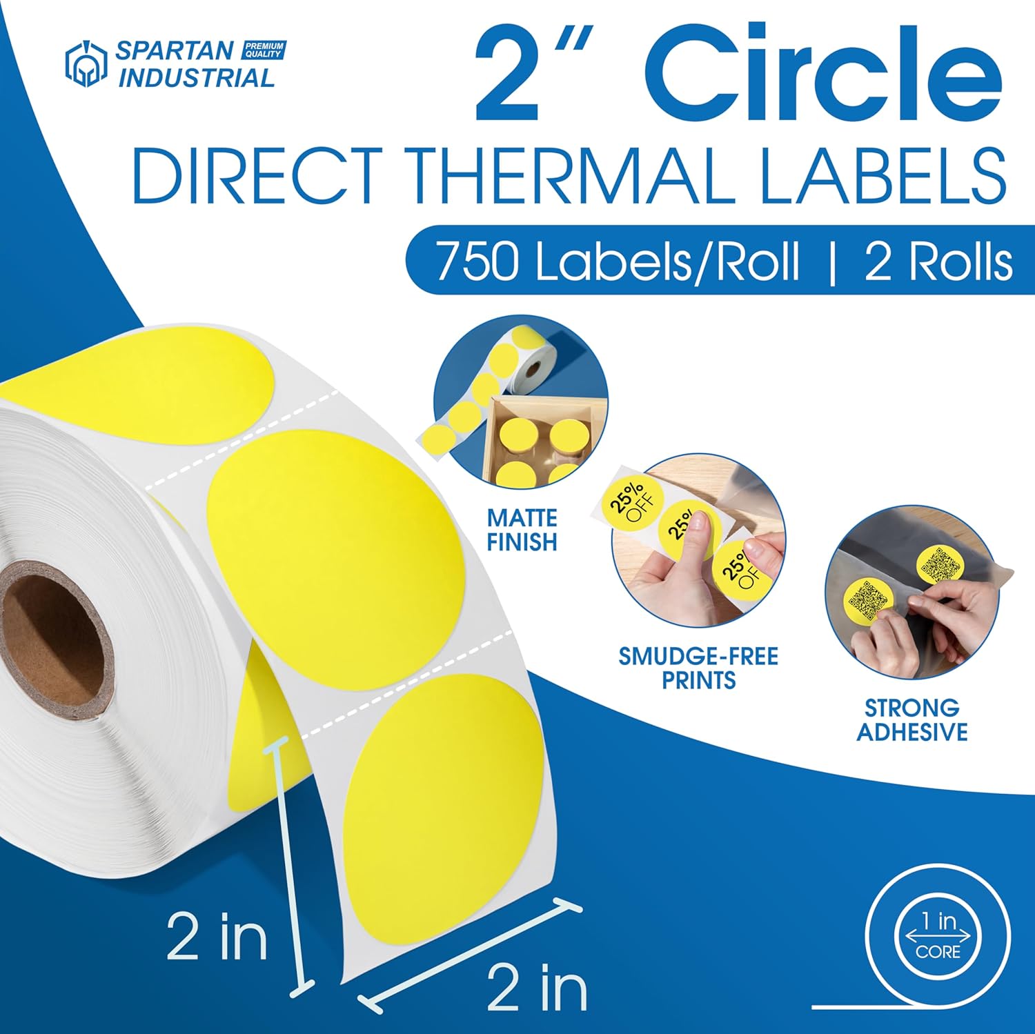 Spartan Industrial 2" Round Direct Thermal Yellow Labels | Perforated Custom Circle Logo Stickers - Works with Rollo, Zebra, MUNBYN Desktop Printers - 2 Rolls, 750/Roll