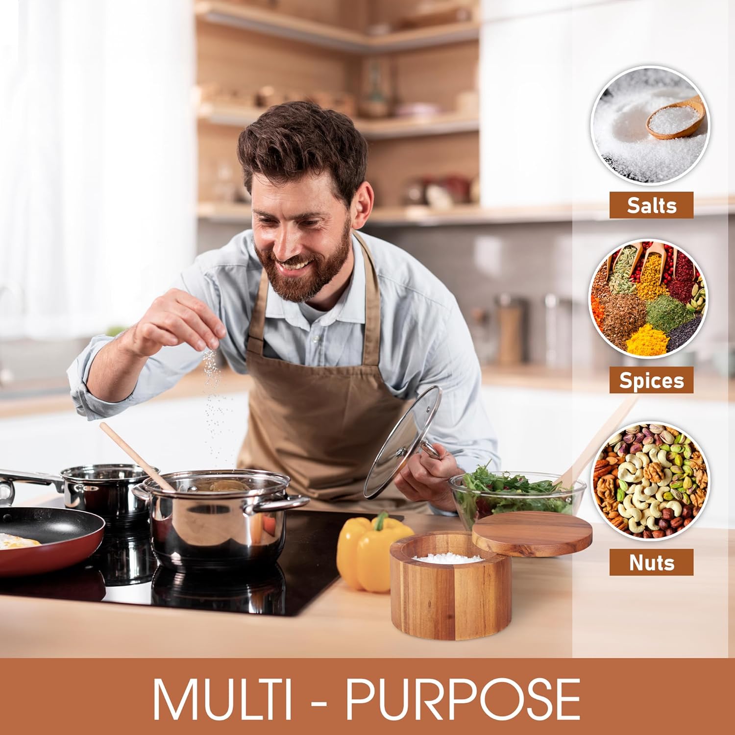 - Acacia Wood Storage Saver: Our acacia salt storage is crafted by skilled artisans with years of experience. The salt box boasts thick wooden edges and a smooth outer surface, showcasing the exceptional workmanship of our dedicated workers in our workshop. Enjoy not only the practical functionality of this storage box but also its beautiful aesthetic.