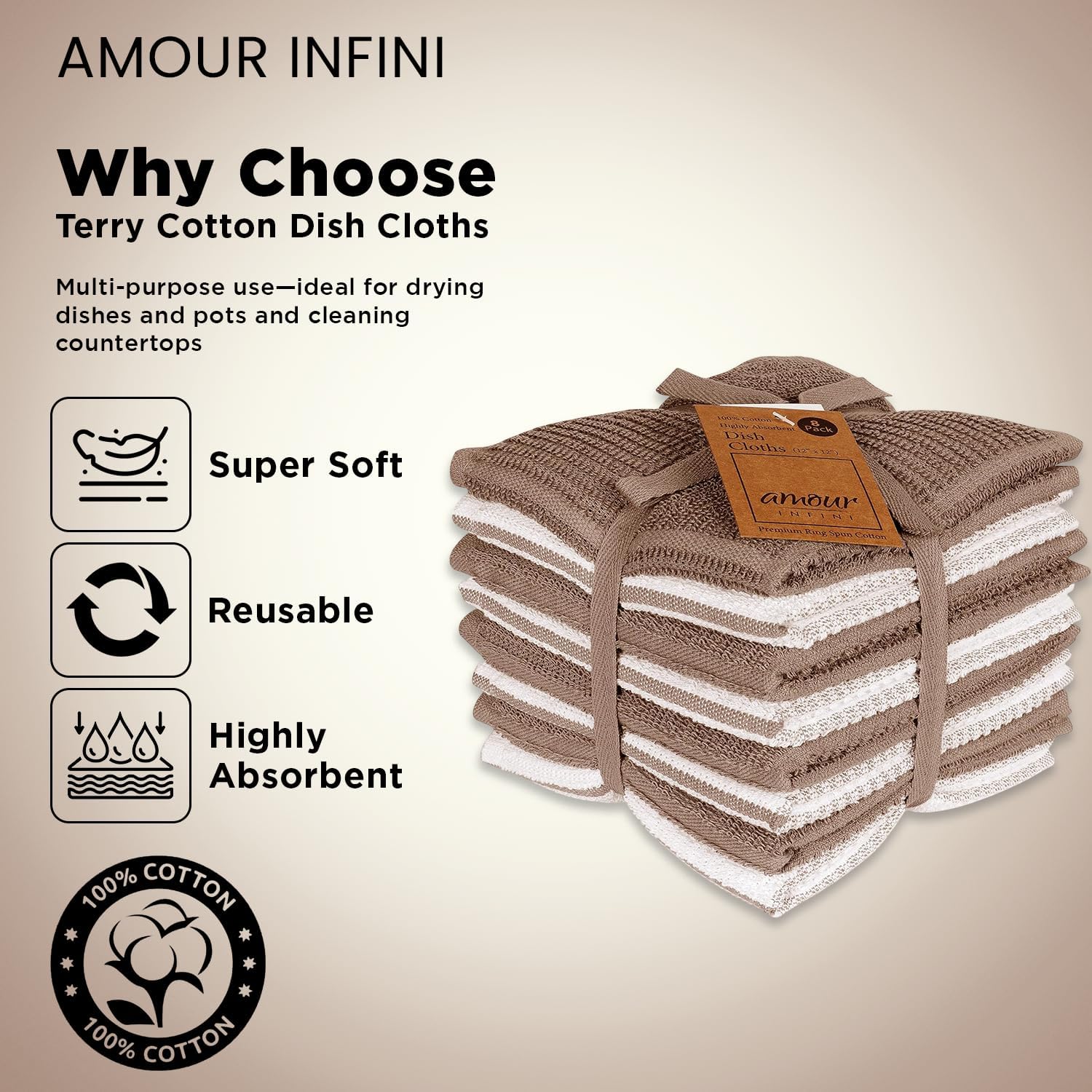 AMOUR INFINI Dish Cloths for Washing Dishes Set of 8 - Highly Absorbent, Super Soft Kitchen Dishcloths - Reusable Quick Dry Dish Rags for Cleaning & Drying Kitchen Linens (12x12 Inch - Brown)