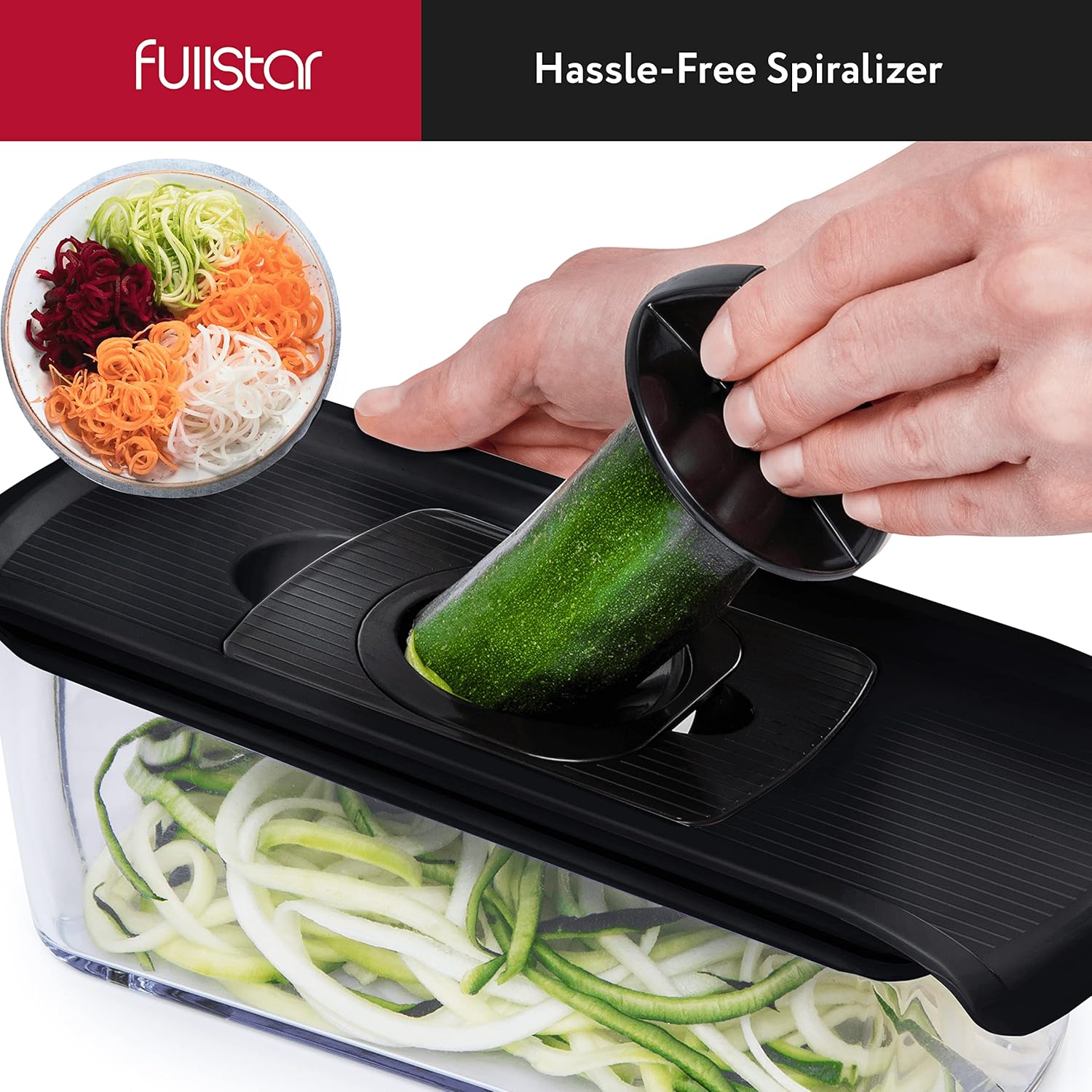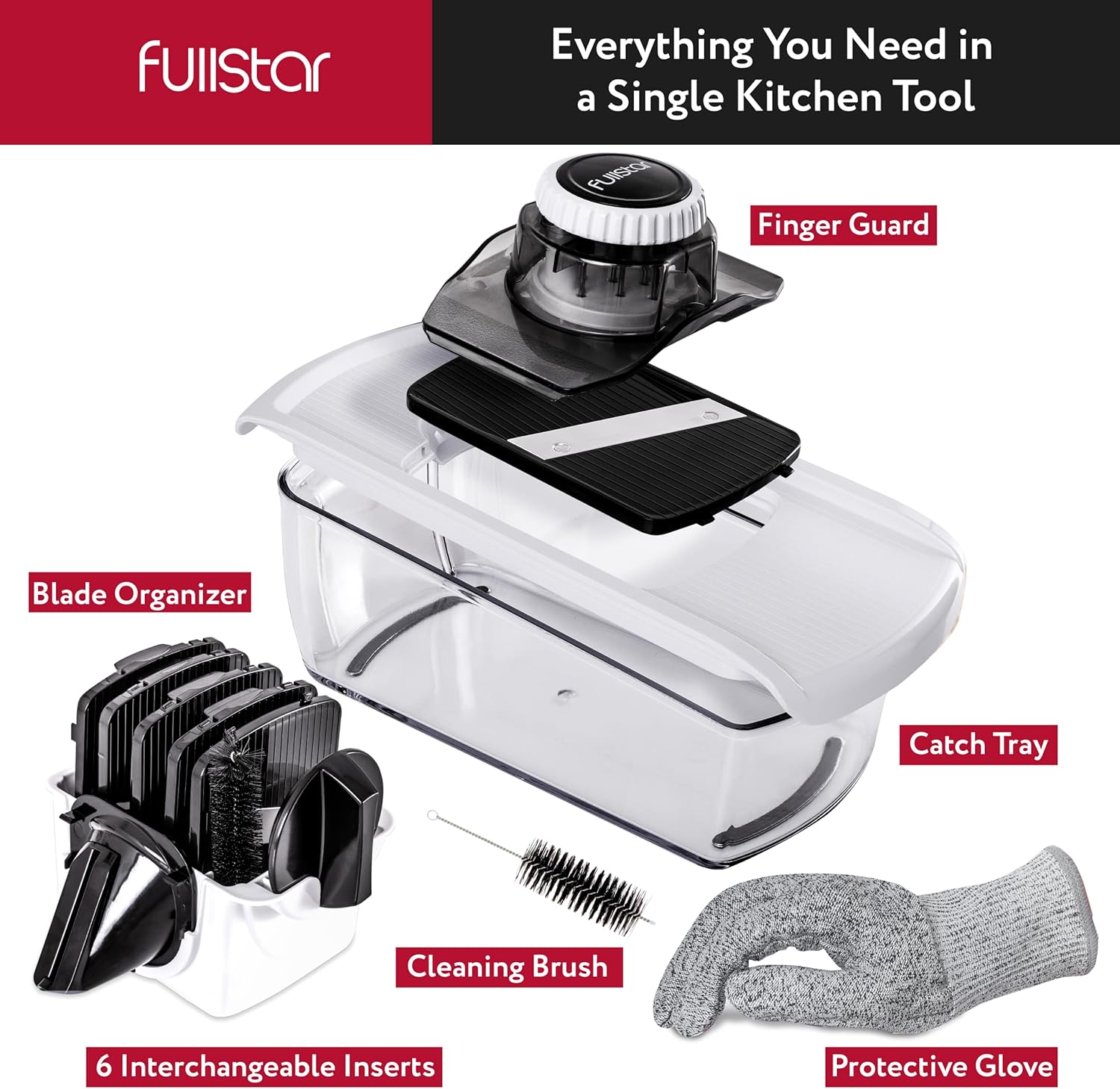 Fullstar Mandoline Slicer for Kitchen, Fruit Cutter, Cheese Grater, Cucumber Slicer, Veggie Spiralizer, Food Cutter & Kitchen Gadgets with Safety Glove (6 in 1, Black)