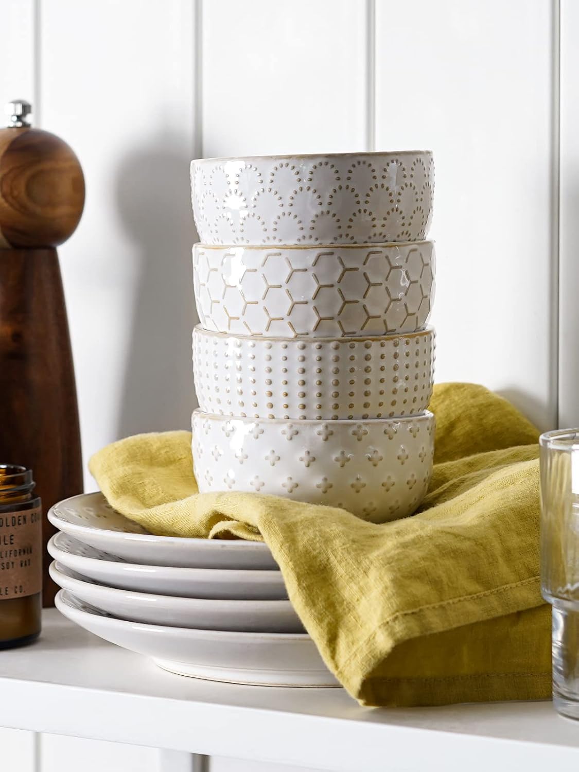 - House Warming Present Idea: Each bowl has a different pattern embossment. The outside of the bowl is embossment. The inner glaze is a smooth ceramic surface. New homeowners will like the timeless farmhouse look of these bowls