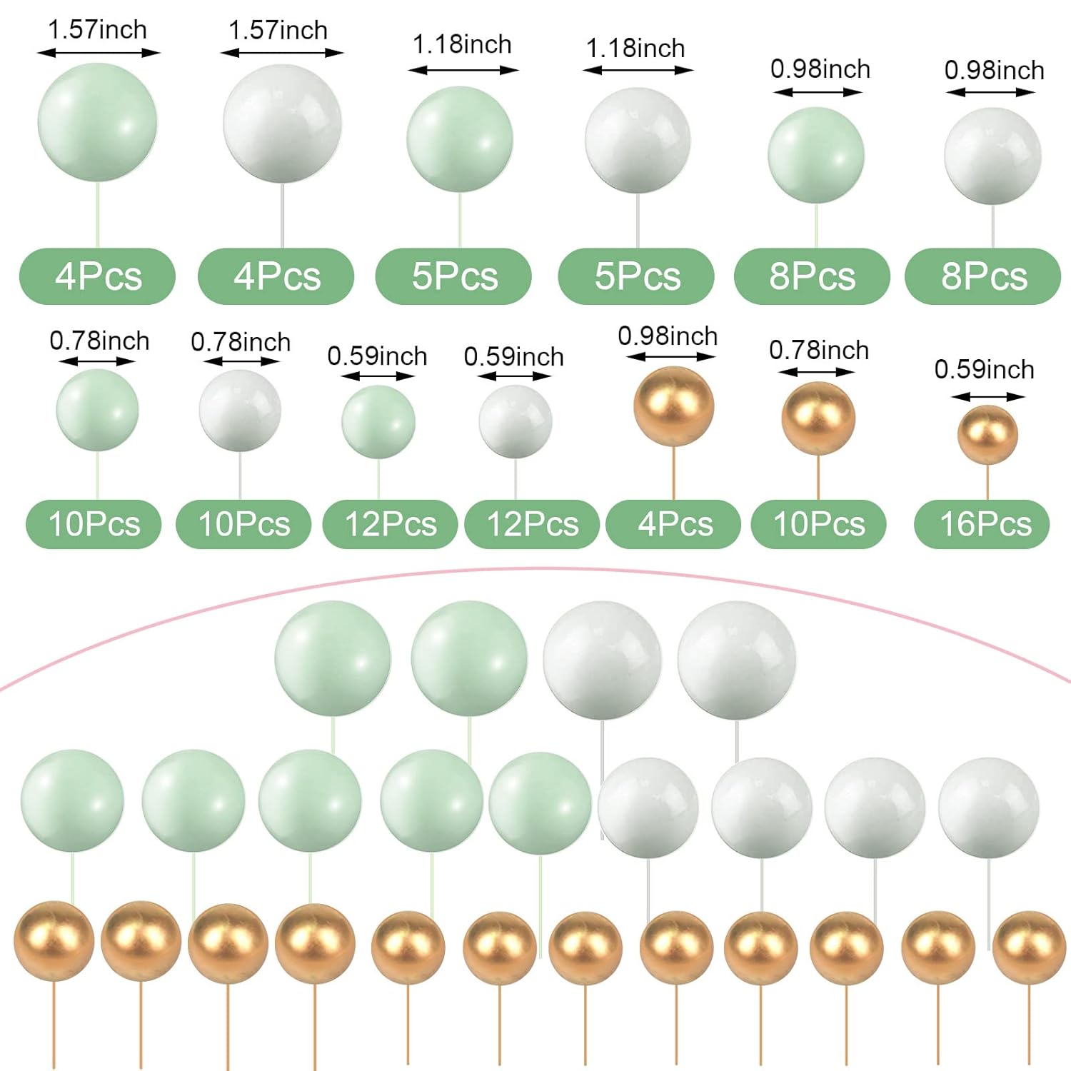 108 Pcs Balls Cake Topper DIY Cupcake Insert Foam Balloons for Cake Baking Wedding Anniversary Birthday Decoration(White, Green, Gold,Multi Sizes)