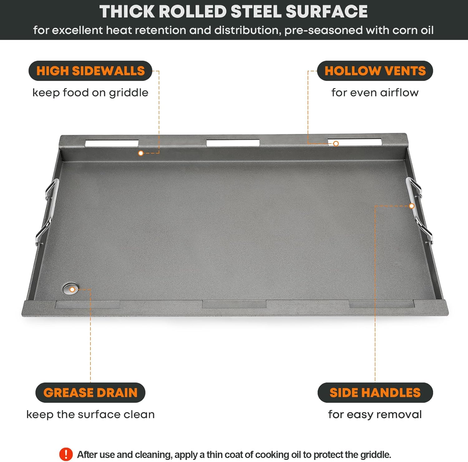 - Sandblasting thick rolled steel griddle for rust prevention, durability and long service life