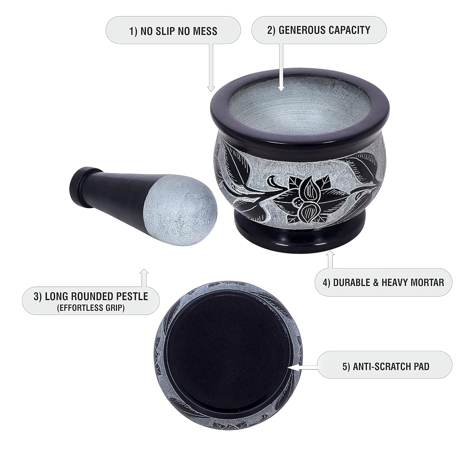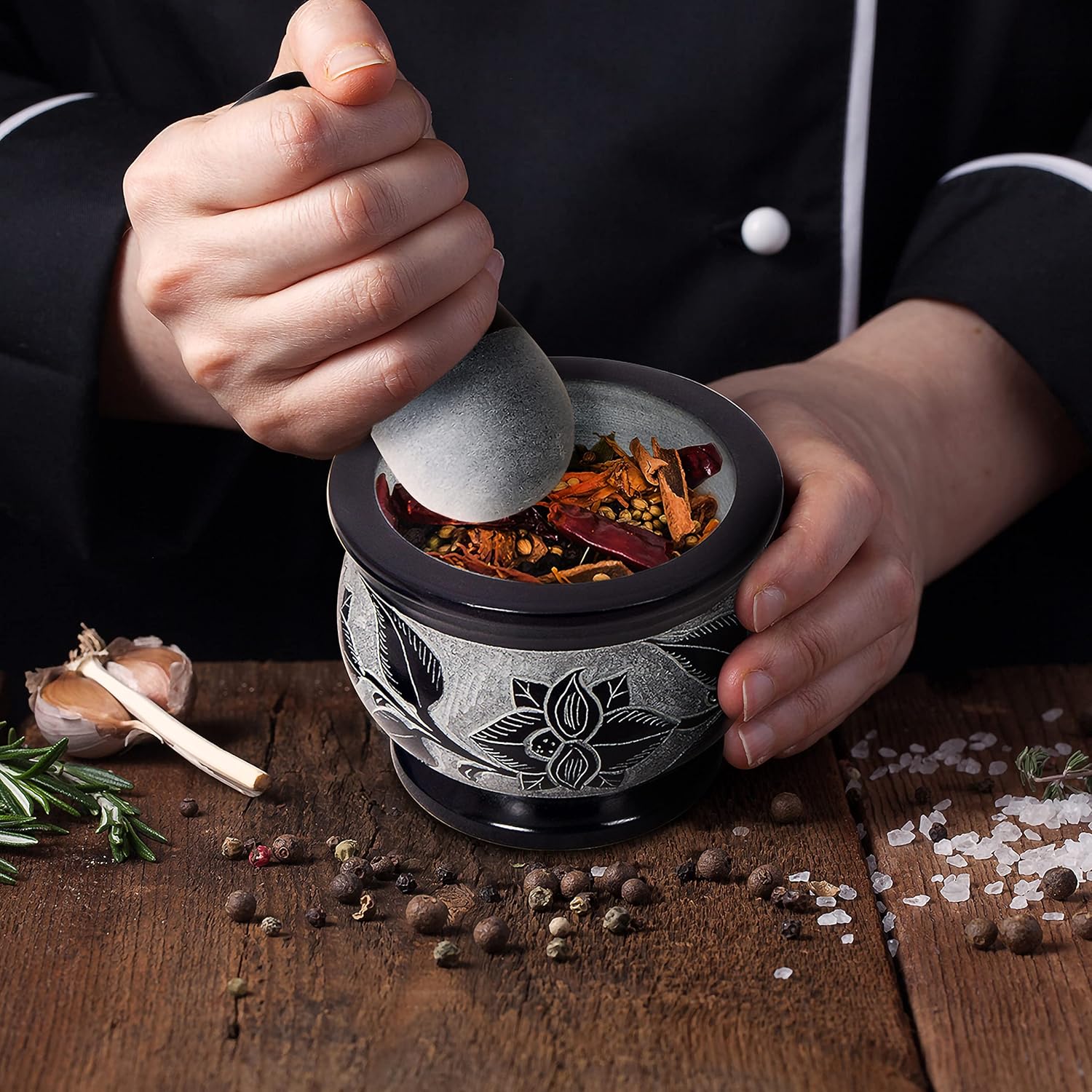 - THE PERFECT BLEND OF FORM AND FUNCTION! - The mortar and pestle have been used for centuries as the perfect way to grind and mix ingredients. Experience the beauty and utility of our mortar and pestle which is expertly crafted with striking floral engraving, giving it a unique identity that complements any kitchen decor.