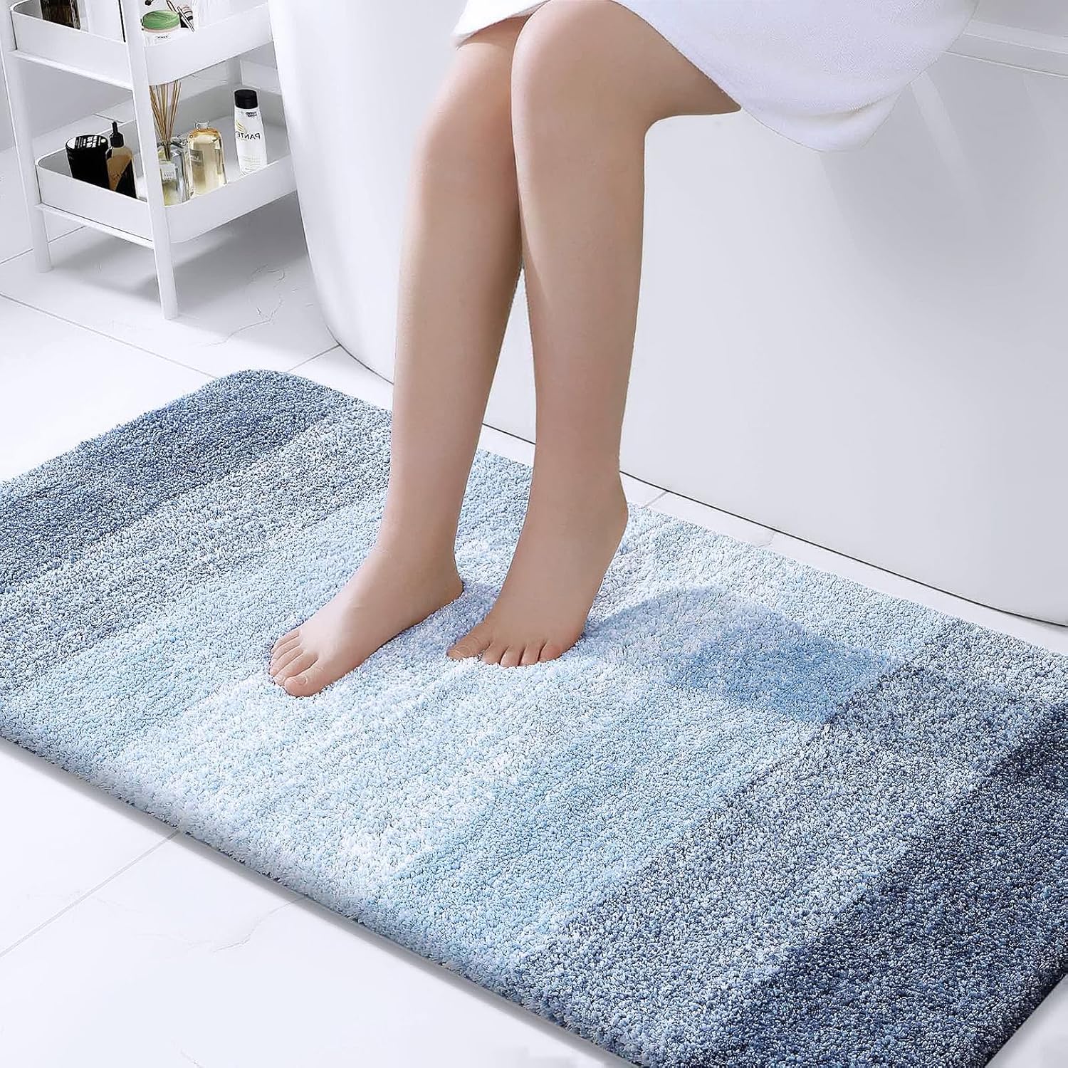- [Luxuriate in Pure Comfort] Indulge your feet in the softest, coziest microfiber imaginable. With its plush pile, nearly one inch thick, our bath mat soothes and warms your feet, protecting them from the cold floor below. Enhance your bathroom decor with OLANLY's captivating bath mat. The gradient color stripe design seamlessly merges stripes, creating an eye-catching pattern that infuses sophistication into your space.