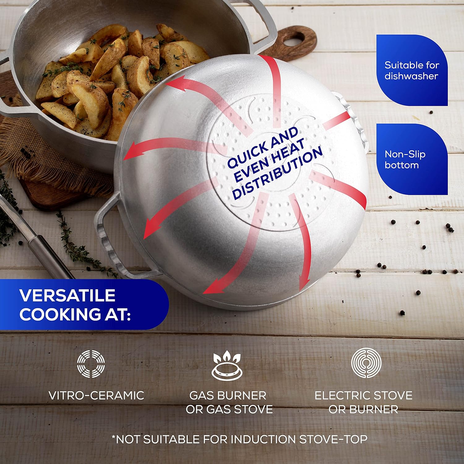 - 🔒 Enhanced Safety & Professional Control: Designed for high-paced kitchen environments, this heavy-duty casserole features a drip-free lid, a non-slip base, and a wide, heat-resistant knob to prevent burns during handling. It’s compatible with gas, vitroceramic, and electric stovetops—and when you remove the lid, it’s oven-safe, meeting the highest professional cooking standards.