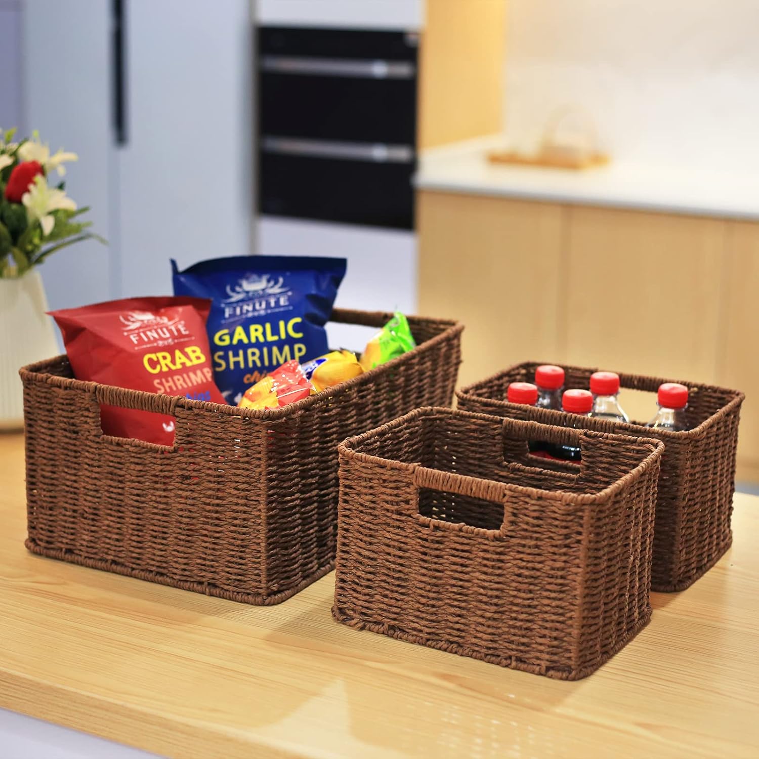 - Durable and Versatile: these pantry baskets are made of a metal wire frame and handwoven twisted paper rope, hand-woven by skilled workers, clean up and organize your home with these rattan-style plastic baskets.