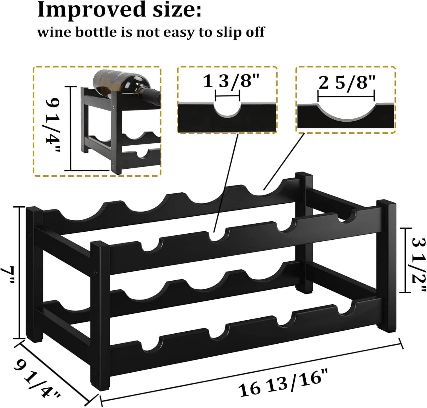 - Overall Dimension (Assembled measurements): 16.85 L x 9.25W x 7H; The wine rack holds up to 8 bottles (2 layers & 4 bottles each layer)