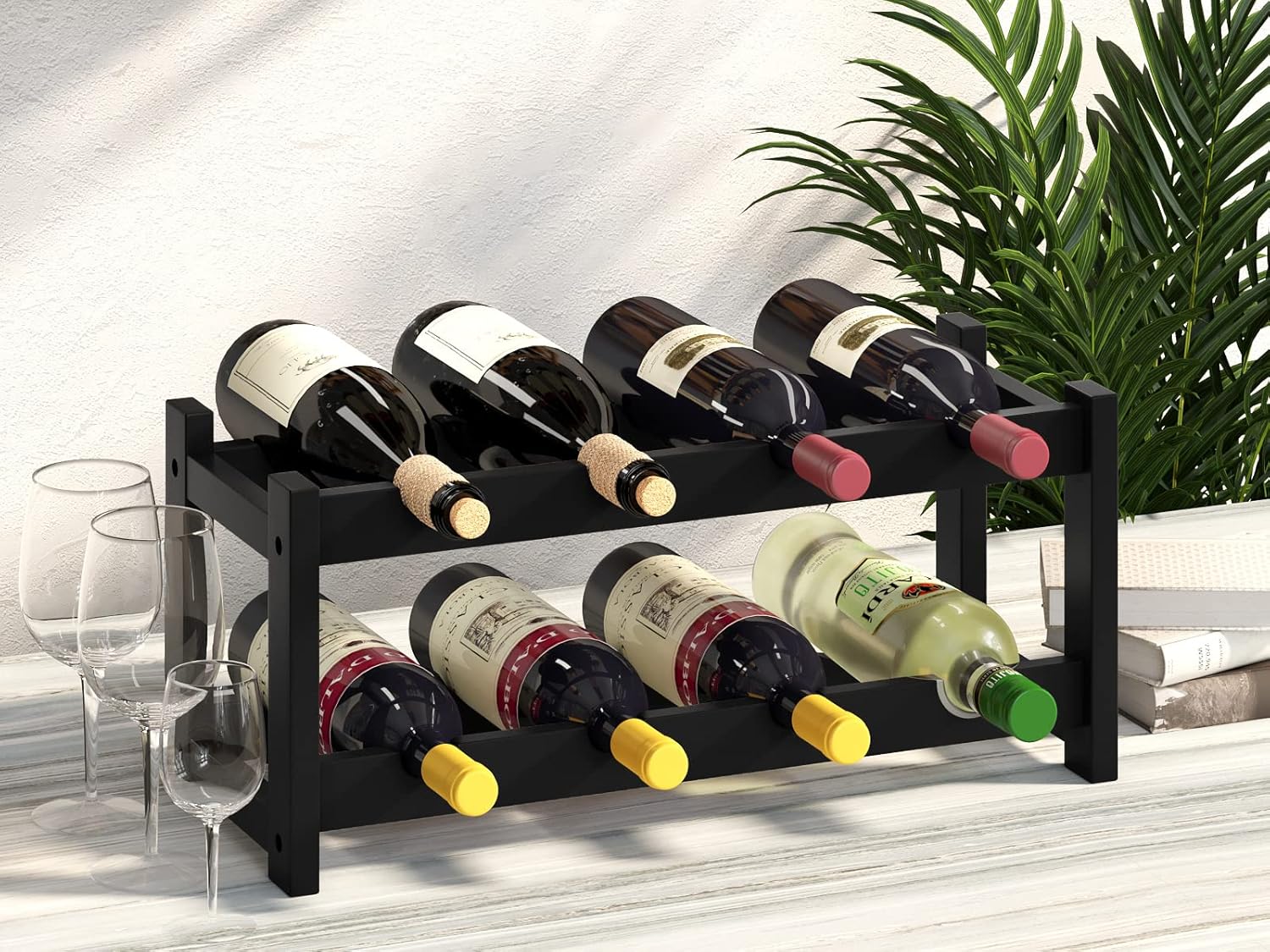 BAMEOS Wine Rack Freestanding 8 Bottle 2 Tier Bamboo Wine Racks Countertop Cabinet Wine Holder Wine Storage Shelf for Kitchen, Bar, Pantry, Wine Cellar, Countertop Black (16.85 L x 9.25W x 7H)