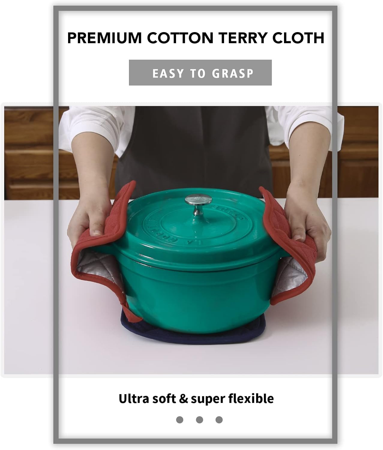 - QUILTED AND PADDED - Heat resistant up to 400 degrees allowing safe removal of baking dishes and cast iron from the oven and hot pots from the stove.