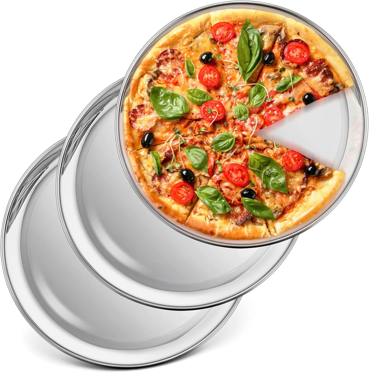 - 【HEAVY DUTY】Round pizza pan with solid stainless steel construction, Distributing heat evenly and resisting warp and rust, Reusable and durable use for a long service life, They comes with proper weight and feels sturdy when holding in hands