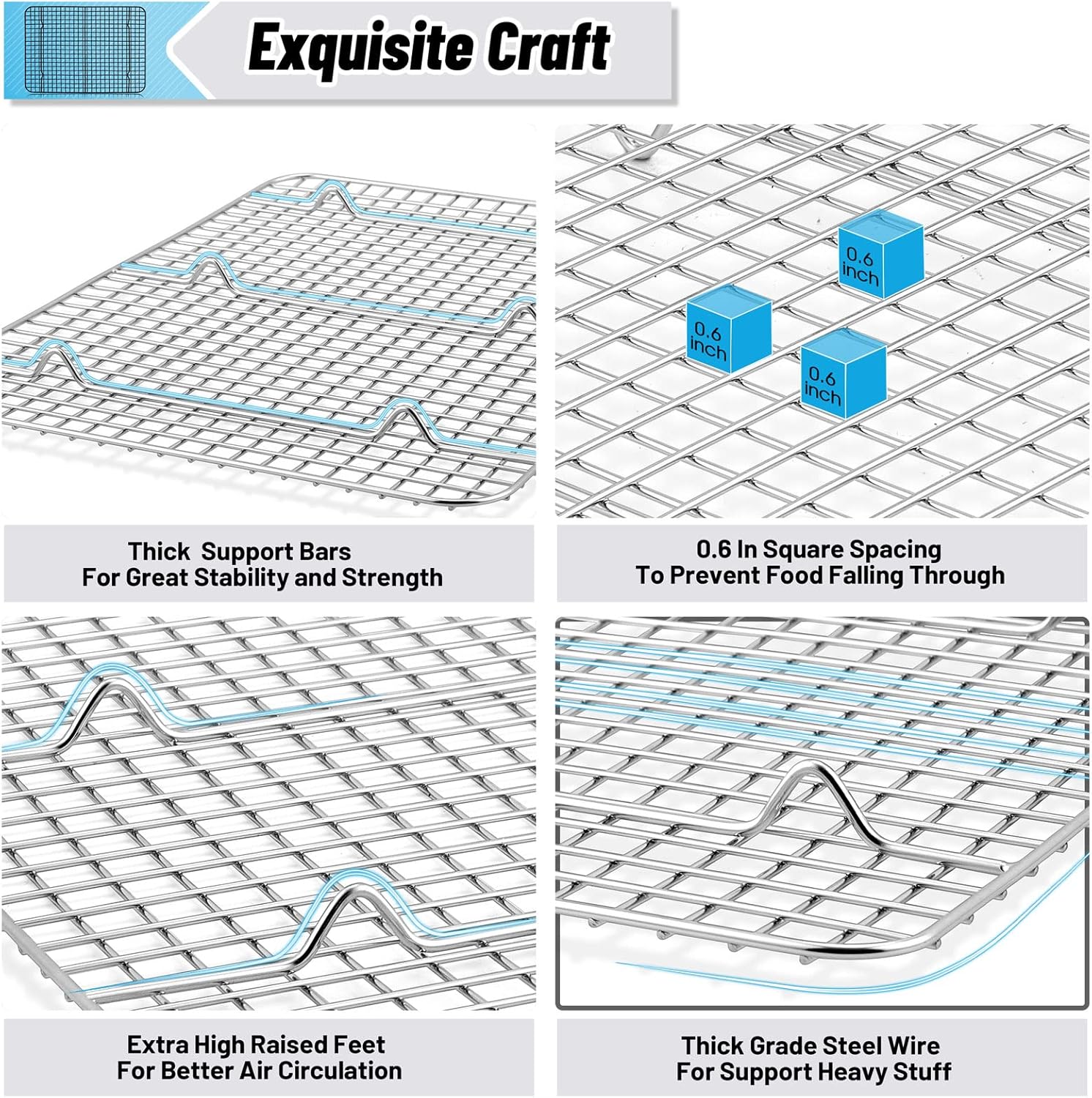 - Cooking Evenly & Quickly: The cooking rack with 0.6β x 0.6β grid spacing let grease drip through while avoiding the food from falling off, 0.75 inch elevated feet raised the entire rack up, Helps create proper air circulation for evenly baking and quickly cooling, Heavy gauge wires are able to withstand both hot and cold temperatures, Perfect for all types of use